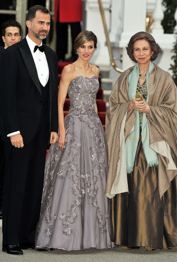 Любопытно, что для приема королева решила повторить наряд от Felipe Varela, запомнившийся модным обозревателям в апреле 2011 года. Тогда в платье с лифом бюстье и пышной юбкой с отделкой цветами Летиция была одной из самых эффектных гостий на ужине для королевских особ перед бракосочетанием принца Уильяма и Кейт Миддлтон.