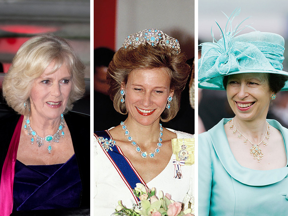 Король Иордании Хусейн подарил Елизавете II комплект украшений c бирюзой и сапфирами во время своего официального визита в Англию в 1966 году. Когда монарх нанесла ответный визит в 1984-м, — надела этот комплект на государственный банкет, чтобы выразить признательность Хусейну.