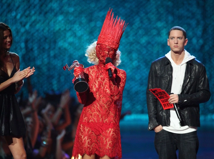 Чего только стоят наряд из плюшевых лягушат Кермитов и испуганный взгляд рэпера Эминема, когда он вручал певице в кроваво-красном кружевном платье и такой же вуалью на лице награду VMA за лучшее видео дебютанта года. Тогда же впервые проявилось пристрастие Гаги к религиозным образам, когда в сентябре 2009 года она выступала на вечеринке V Magazine в красном кружевном боди и прической, вдохновленной Девой Марией.