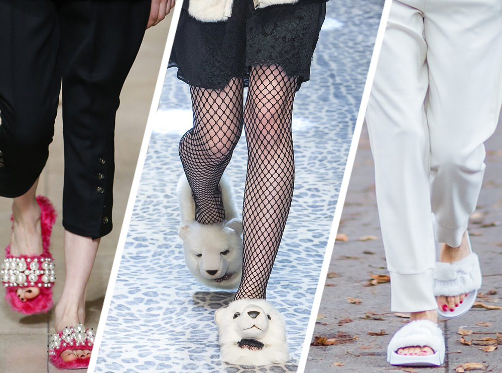 Весной 2016 года тренд начал набирать обороты. «Меховые» туфли появились в осенне-зимних коллекциях брендов, вроде Sonya Rykiel и Miu Miu. Если первые украсили пышными черными помпонами обычные босоножки, то вторые выпустили целое попурри из ярких разноцветных «пушистых» шлепанцев, расшитых огромными жемчужинами.