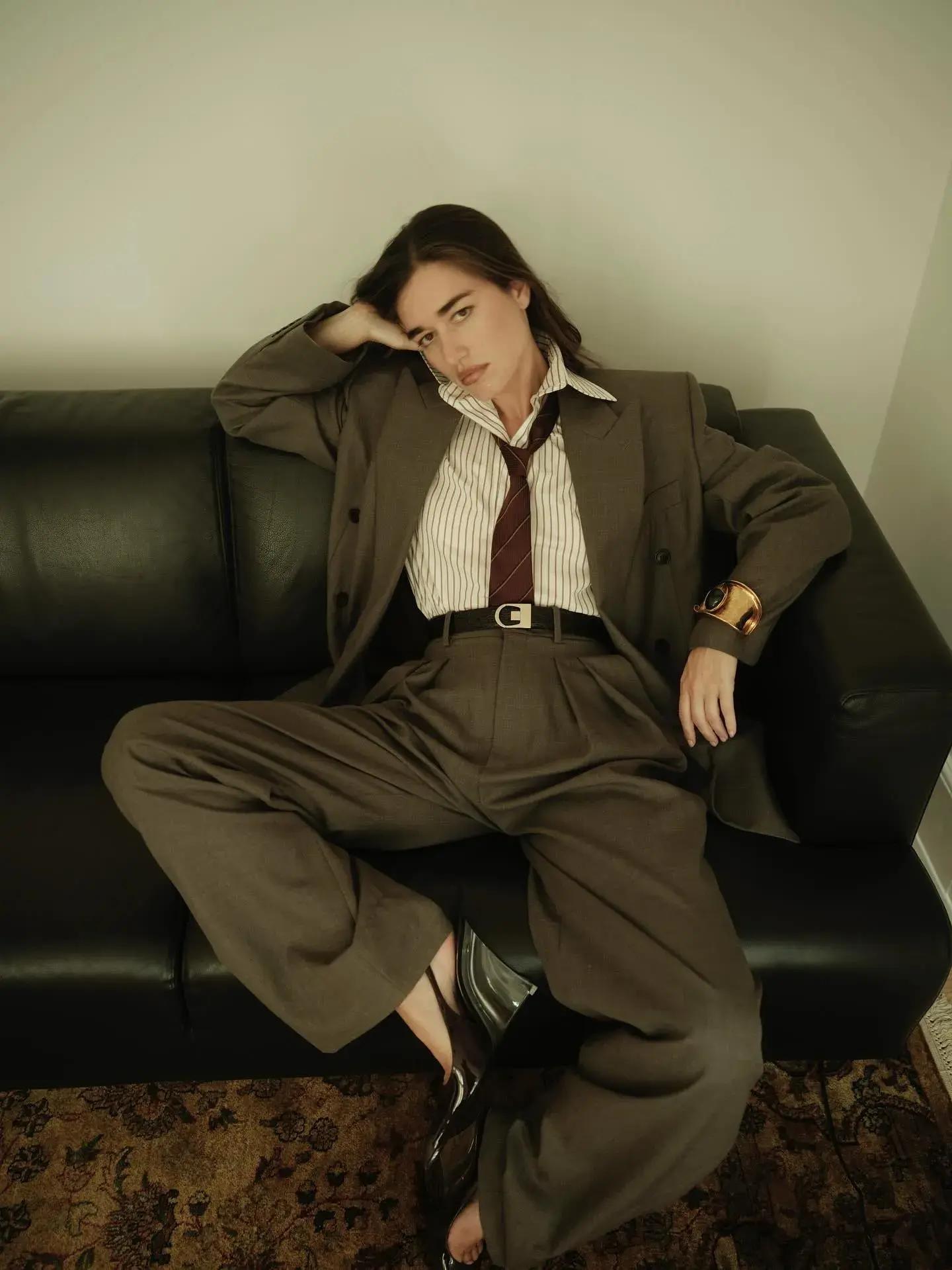 Замша добавляет образу тот самый флер «тихой роскоши»: шоколадный пиджак, костюмные брюки, кашемировый свитер и лодочки или сапоги‑трубы — формула для тех, кто хочет выглядеть дорого без кричащих логотипов и излишней многослойности. В выходные тот же жакет можно надеть с белой футболкой и светлым денимом, заменив каблуки на кеды.