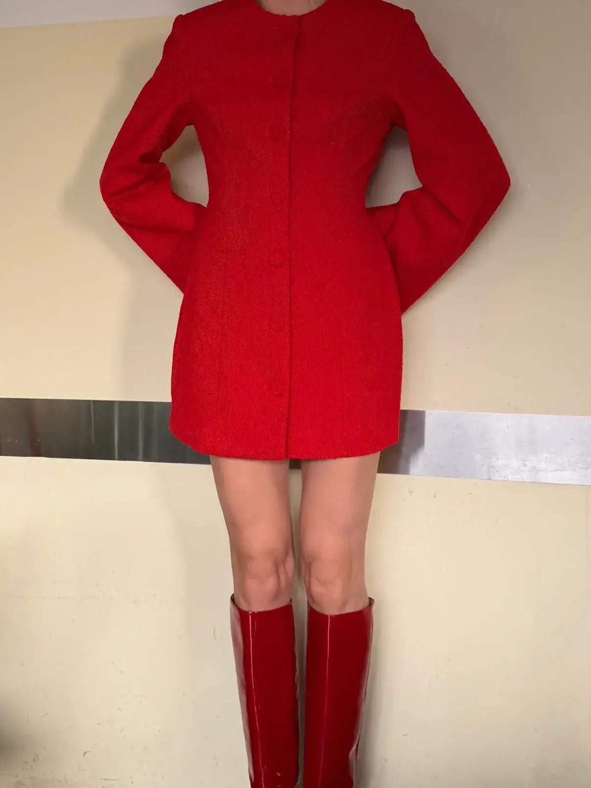 Вечером этот же жакет легко превращается в мини‑платье: застегните его на одну‑две пуговицы, добавьте капроновые колготки, остроносые балетки или сапоги‑чулки. Важно не перегружать образ украшениями: одной цепочки или пары сережек‑гвоздиков будет достаточно, чтобы подчеркнуть линию шеи.