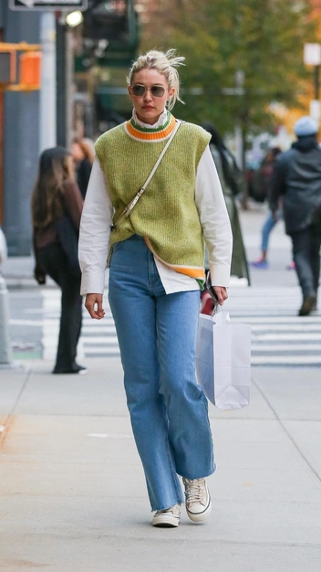 Нравится нам и многослойная стилизация Джиджи Хадид: супермодель надела поверх плотной белой рубашки акцентный жилет, который она заправила в джинсы, оставив край классического элемента аутфита.