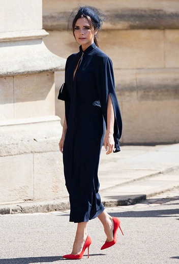 19 мая, Виндзор. Принц Гарри женится на Меган Маркл. Приглашение на королевское торжество получают 600 человек, среди которых самая показательная семья Великобритании — пара Дэвида и Виктории Бекхэм. Прославленный футболист, следуя свадебному дресс-коду, появляется в «утреннем» костюме, сшитом специально для него новым креативным директором мужского Dior Кимом Джонсом. Виктория же решается повторить «подвиг» семилетней давности и появляется в… темно-синем платье, которое простые пользователи тут же окрестили «траурным». Правда, разница с образом, который Вики создала для свадьбы Кейт Миддлтон и принца Уильяма, все же есть: красные замшевые лодочки. Мы считаем, что именно они и спасают образ от «похоронных» ассоциаций. В этом их сила: красные туфли даже самое аскетичное платье сделают нарядным.