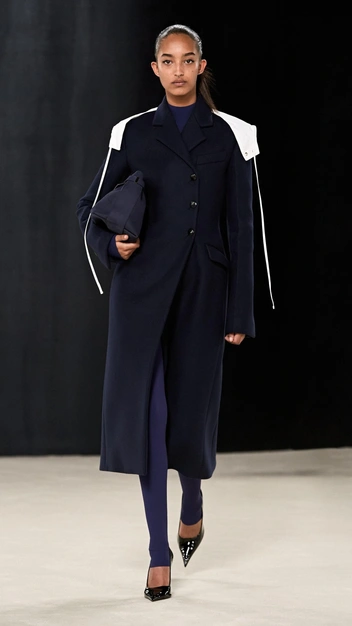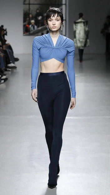 Наряду с откровенностью и сексуальностью в тренде минимализм, который коснулся и леггинсов. Atlein сочетает удлиненные лосины, прикрывающие остроносые туфли на платформе, с укороченным топом. Но делает бренд это искусно и аккуратно: оттенки синего гармонично перекликаются в подиумном луке, создавая тандем стиля, простоты и минимализма.