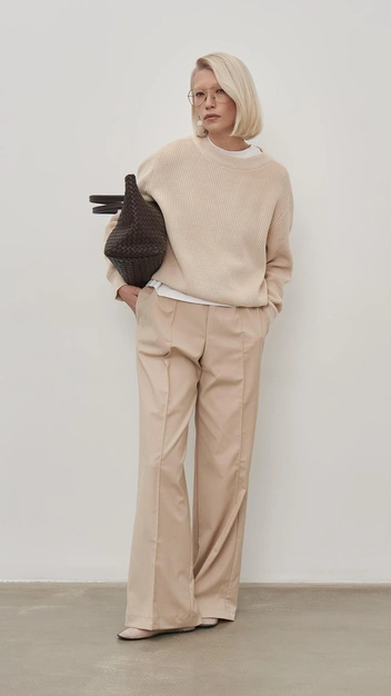 Простота и роскошь достигается с помощью монохромных образов, которые всегда выглядят дорого. Для такой стилизации выбирать следует благородные оттенки (беж, молочный, шоколад, кофе, охру, синий, хаки, оливковый) и качественные материалы, как кашемир и хлопок, представленные в коллекции российского бренда Dasha Phi с вязальным производством в Екатеринбурге.