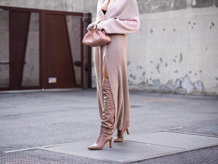 Это одно из самых уютных сочетаний на зиму, ведь в высоких сапогах вам будет тепло. Наденьте лаконичное трикотажное платье, сделайте акцент на талии с помощью ремня, если силуэт свободного кроя, и подберите к женственному образу обувь на каблуке, например, сапоги-чулки или сапоги-слоучи (читайте также: Прибавят возраст: 6 моделей обуви, которые старят абсолютно всех женщин). Сочетайте выход с длинными шубой или шерстяным пальто. Платье можно заменить на комбинацию свитера и юбки длиной миди, что придаст вам стройность и элегантность.