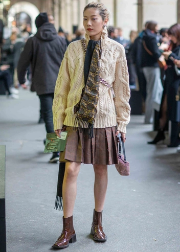 Вы можете пребывать в тепле и комфорте даже в достаточно короткой юбке, если правильно выберете материал. Самый надежный вариант — шерсть. Будь то твид или букле, подобные материалы надежно защитят вас от холода и ветра. Шерстяные юбки как нельзя лучше смотрятся с жакетами и свитерами — и не забудьте добавить к ним надежную нескользкую обувь и миниатюрные кокетливые (или брутальные) аксессуары.