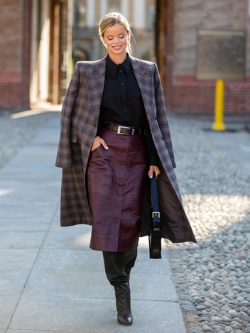 Юбка из натуральной кожи — надежный способ утеплиться в холодный сезон и выглядеть максимально эффектно. Подобные модели хороши не только устойчивостью к холоду и ветру, но и комплиментарной посадкой и широкой сочетаемостью с другими предметами гардероба. Чтобы быть на высоте, будет достаточно водолазки, грубых ботинок на толстой подошве и трендовой сумки. Ну а если хочется чего-то особенного, пусть все вещи в комплекте будут кожаными — и рубашка, и юбка, и обувь.