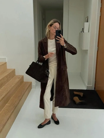 Самый простой и верный способ вписать замшу в свои зимние образы — сделать ставку на плащи, пальто и куртки. В этом году особенно актуальны изделия прямого кроя в самых теплых оттенках: от карамельного до глубокого шоколадного.