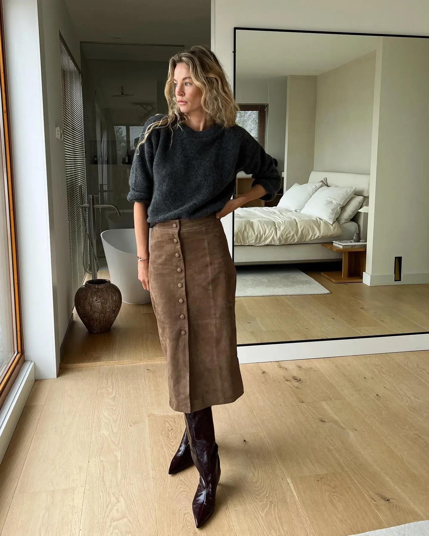 Для кэжуал-выходов сочетайте замшевую юбку с объемными свитерами и высокими сапогами, а для вечерних или светских образов — с шелковой блузой и ботильонами на акцентом каблуке (читайте также: Теплая обувь: выбираем стильную пару на холодный сезон у российских брендов).