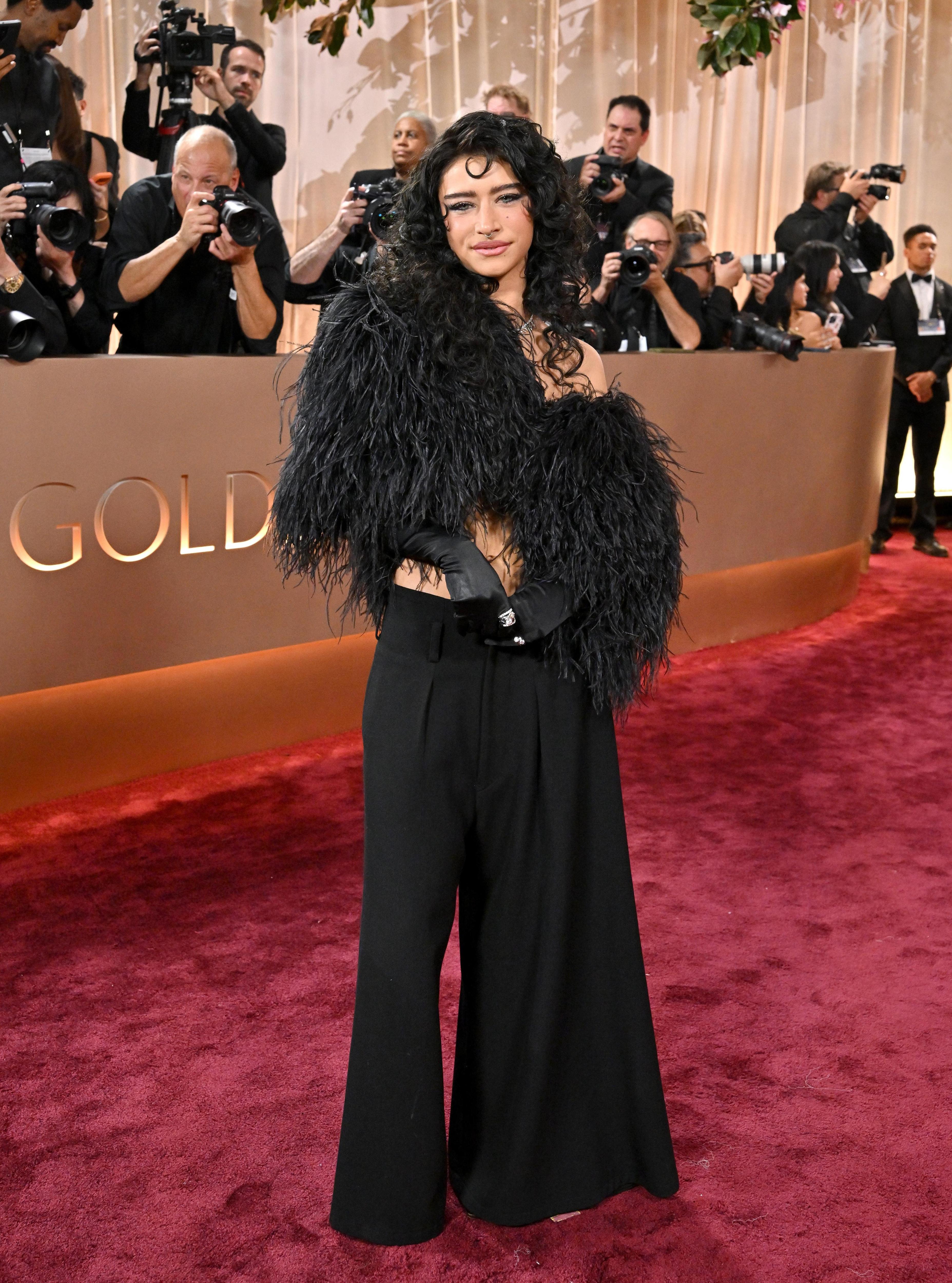 Пока половина селебрити выходит в свежих кутюрных платьях, Одесса выбирает черный винтажный топ Dolce & Gabbana с открытыми плечами, а прическу и макияж вовсе делает самостоятельно.