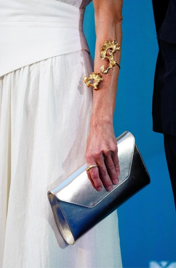 Образ также дополнили серебряные туфли Aquazzura на высоком каблуке и клатч от Magrit. Королева также выбрала гладкую укладку и макияж с сияющим эффектом, в котором ставка была сделана на натуральность и простоту. Завершить же аутфит Летиция решила крупным браслетом-каффом от мадридского бренда Suma Cruz, надетым на предплечье, и аналогичными крупными серьгами, что только усилило отсылку к античному стилю.