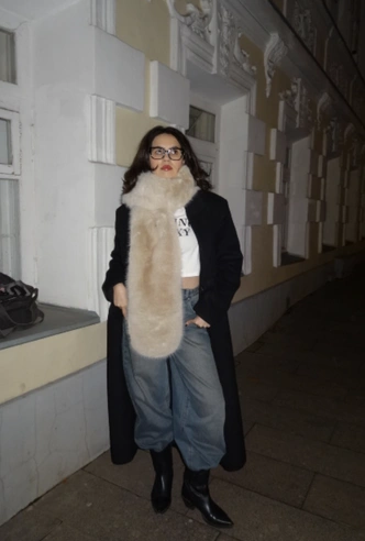 В основе моего гардероба — очень личная база. Для меня это джинсы клеш на заниженной посадке: особенно люблю винтажные Diesel, но и у массмаркета вроде Mango или 12Storeez иногда получаются действительно удачные модели. Зимой я практически не вылезала из красного свитера Pitkina, который надеваю поверх белой футболки — без этого выглядывающего края образ кажется незавершенным. Плюс удобные балетки или ботинки Dr. Martens (зависит от сезона) и акцентная верхняя одежда: леопардовая шуба, тяжелая кожаная куртка или пальто с подчеркнутой талией. Мне нравится строить образы вокруг одной выразительной вещи и давать именно ей право голоса.