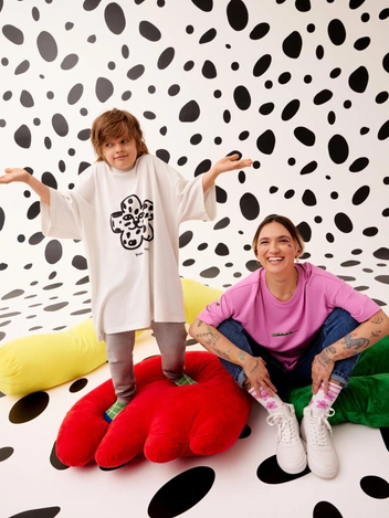 Абстрактная художница Маша Сомик работает с инсталляцией, скульптурой, перфомансом, живописью и коллажем. Ее работы — про любовь, красоту и радость в мире, про поиск простых форм и любование яркими, открытыми цветами. Маша и ее сын Платон стали героями съемки и представили образы из капсулы.