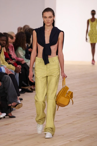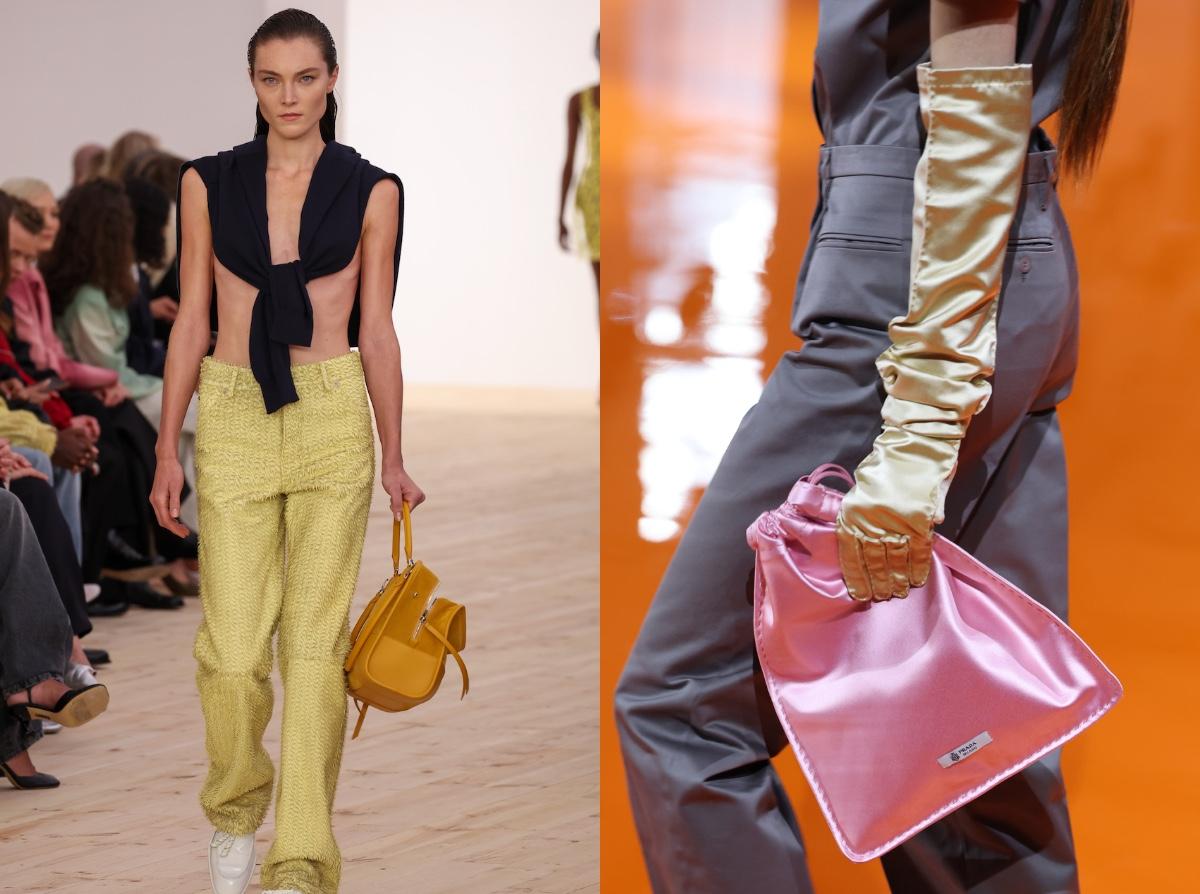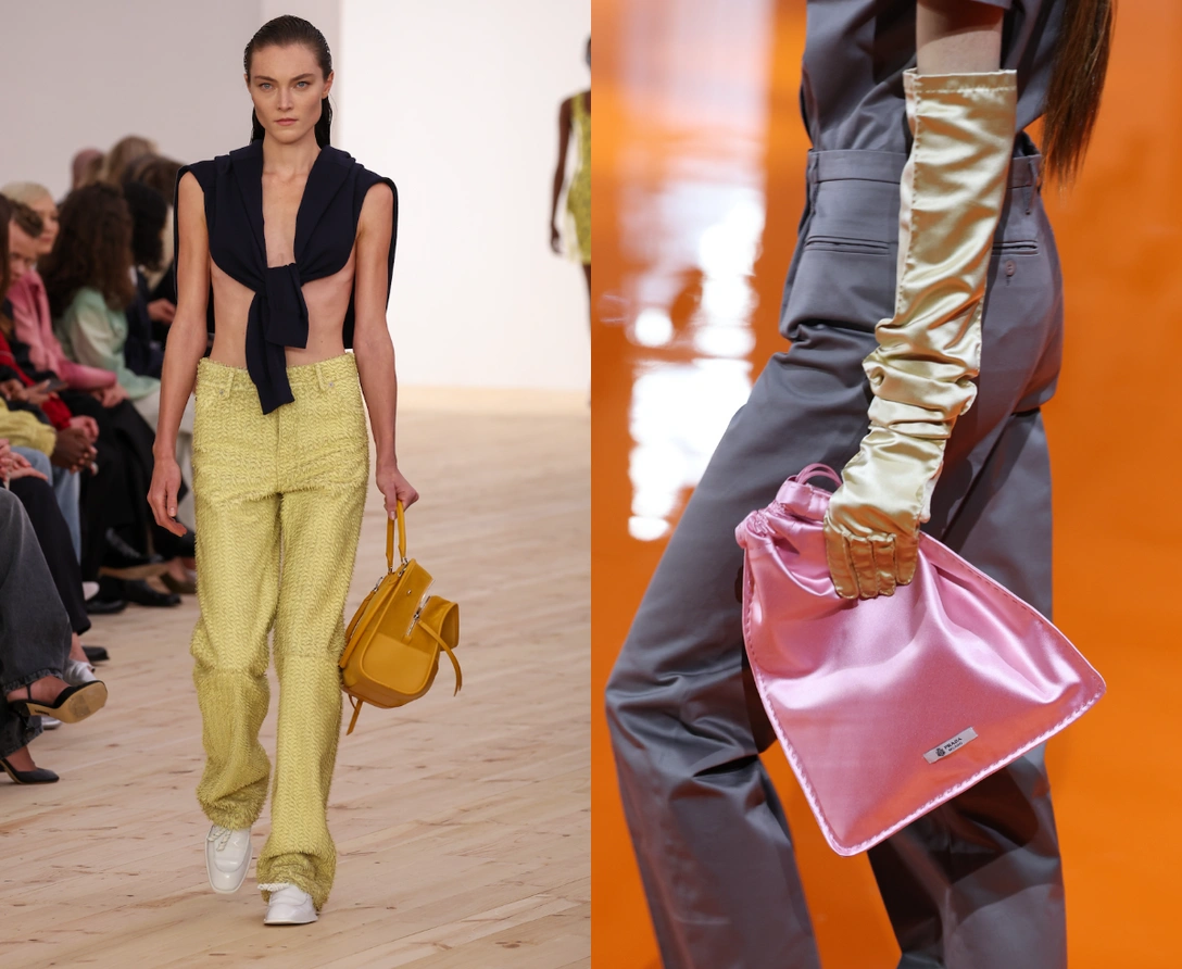 Если говорить о сумках, то главный герой лета 2026 года — мягкий мешочек на шнурке, тот самый drawstring pouch, который зарубежные редакторы уже прозвали silly little pouch. Впервые на серьезных правах он прозвучал у Prada: на показе SS 2026 модели выходили с атласными и нейлоновыми мешочками в оттенках баблгам, горького шоколада и природного зеленого, которые смотрелись как небольшой, но очень точный акцент. Затем тренд подхватили Valentino, Calvin Klein, Loewe и Celine — от вышитых бисером и декорированных бахромой вариантов до лаконичных кожаных крошечных сумок, которые можно носить в руке, на плече или как кросс‑боди (читайте также: Трендовые сумки на весну-лето 2026 года: гид по самым стильным вариантам).