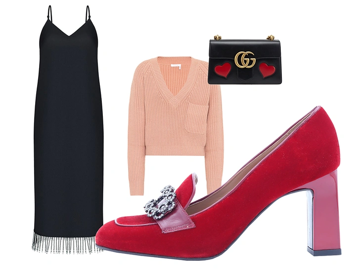 Когда дресс-код вечеринки не обозначен, вы с чистой совестью и карт-бланшем на руках складываете свой образ из всего, чего хотите. Как вариант — шелковая комбинация с бахромой по краю, на которую можно небрежно натянуть объемный трикотажный свитер с глубоким V-образным вырезом, обнажающий тем самым ключицы или даже плечи.