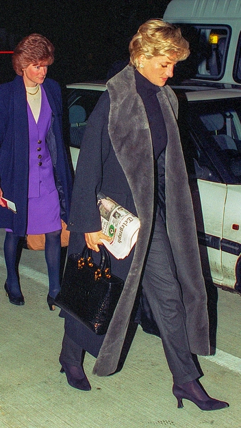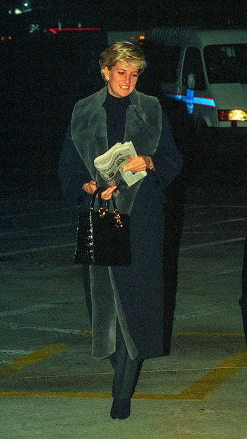 За окном 1996 год, а Диана в это время прибывает в лондонский аэропорт Хитроу в элегантном образе с газетой в руках. Зимой принцесса носила длинную шубу с меховой отделкой и накладными карманами в темно-синем оттенке, который идеально подчеркивал цвет ее голубых глаз. Сочетала ее она, как и здесь, с классическими брюками, однотонным бадлоном, кожаной сумкой и украшениями с жемчугом — ее любимыми, вновь вернувшимися в моду (возможно, именно благодаря Спенсер).