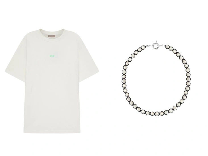 Просто футболка и нитка жемчуга — но вместе происходит магия. Длина жемчужной нитки не принципиальна — длинную можно даже оставить под футболкой, чтобы она красиво просвечивала. А футболку при желании легко заменить белой майкой или лонгсливом.