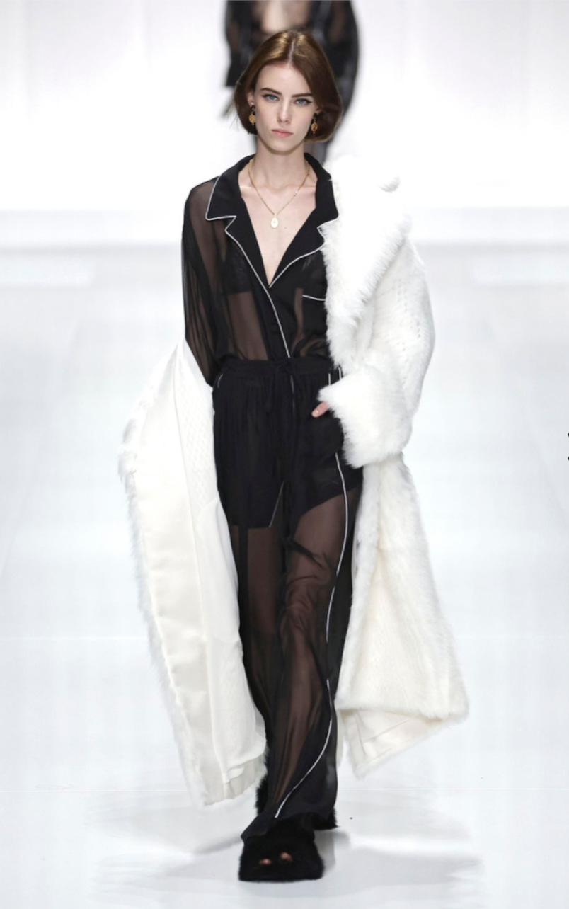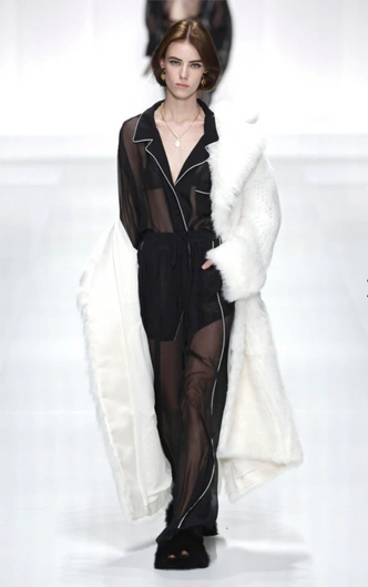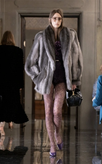 Gucci задают совсем другое настроение, предлагая сочетать богатую шубу с вещами схожей стилистики. Slavic bimbo на показе бренда носит лисью шубу с блестящими колготками и каблуками. И тут, как и в случае с Dolce&Gabbana, не обязательно повторять именно эту стилизацию. Важно уловить общий тренд, а он в том, что шубу нужно согласовывать с чем-то вечерним, как шелковый брючный костюм с показа Tom Ford SS/26.
