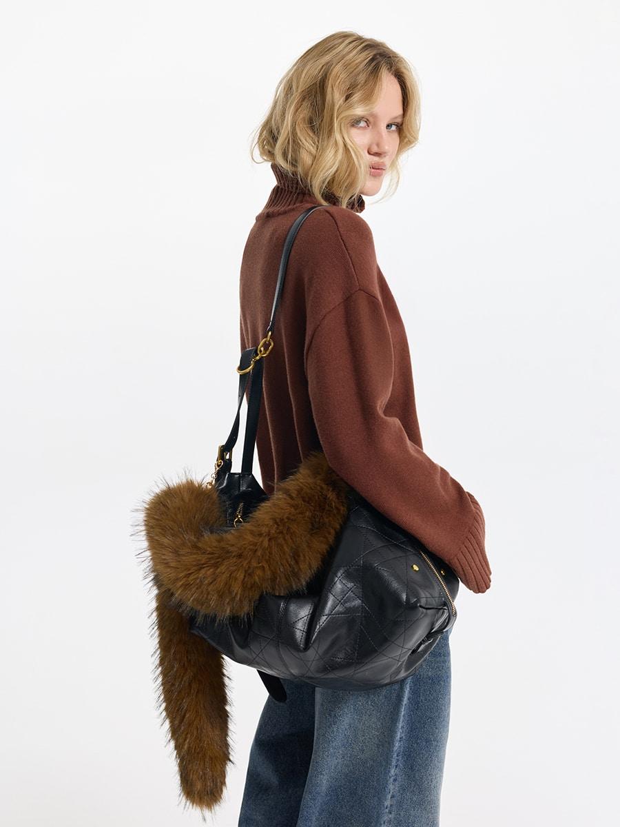 За редкими золотыми лабубу погонялись, пора сменить этот обвес на другой — и, кстати, не менее трендовый. Меховой брелок, напоминающий хвостик, заявил о себе на шоу Acne Studios осень-зима 2025-26, но тут же врезался в память. В аутфит с таким обвесом-кисточкой просится шарф с помпонами с показа Chloe FW/25-26, но о нем чуть ниже. Российские бренды уже представили обвес, который можно надеть на любую сумку — а еще использовать вместо ручки (или в дополнение к ней), как сделали на Diesel осень-зима 2025/26. Взмах волшебной палочки, и даже летняя белая сумка получает зимнюю тональность.