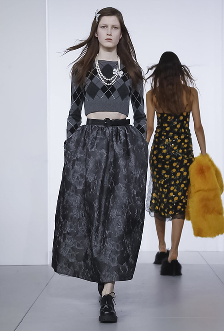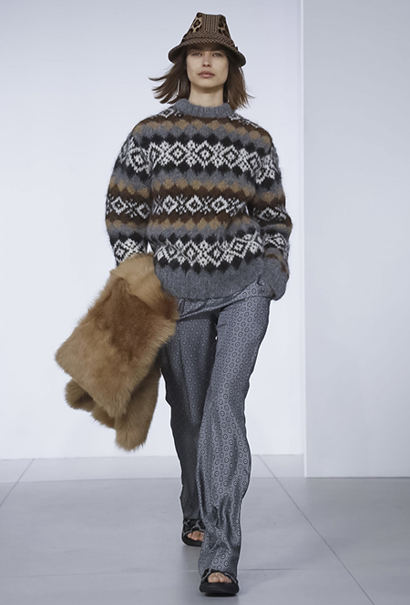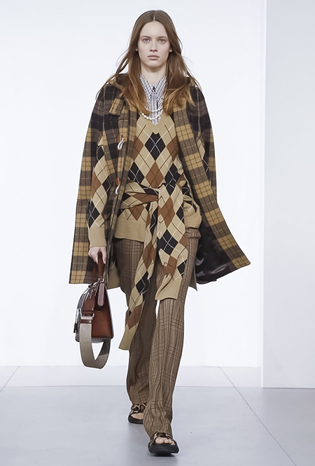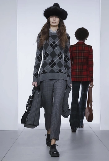 Отдельный вид клетки – ромбы, который еще называют рисунком-аргайл. Этот принт имеет стойкую ассоциацию со стилем преппи, украшая в основном полуформальные предметы гардероба учеников закрытых западноевропейских школ. От этой ассоциации не избавляются они и в коллекции Корса, появившись на темной трикотажной группе.