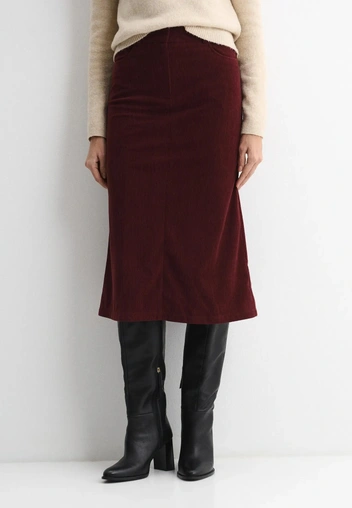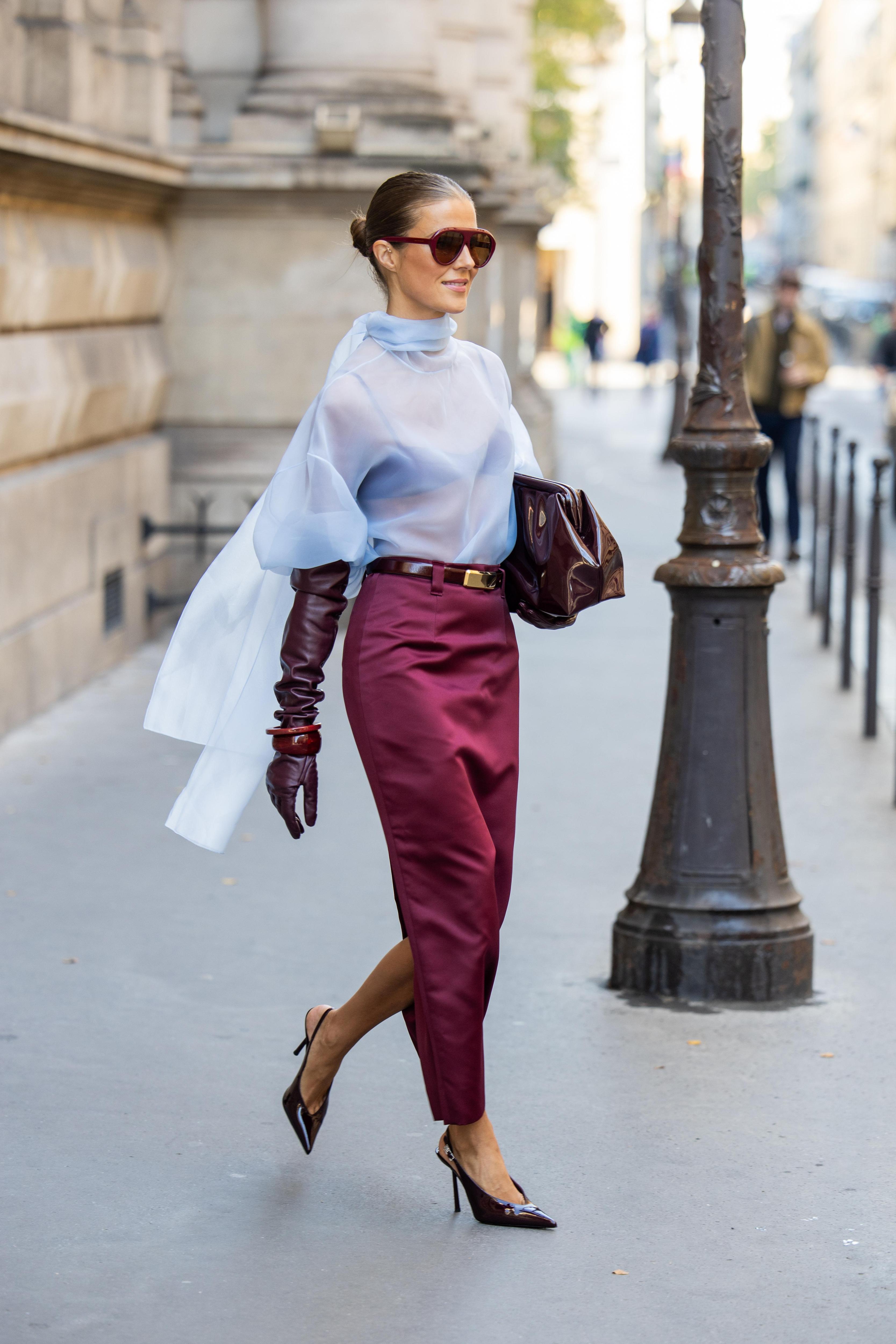Еще один удачный сценарий — трикотажный джемпер, сатиновая юбка и гладкая кожа на ремне и обуви. Именно переход от матового к деликатному блеску делает Black Cherry максимально дорогим на вид.