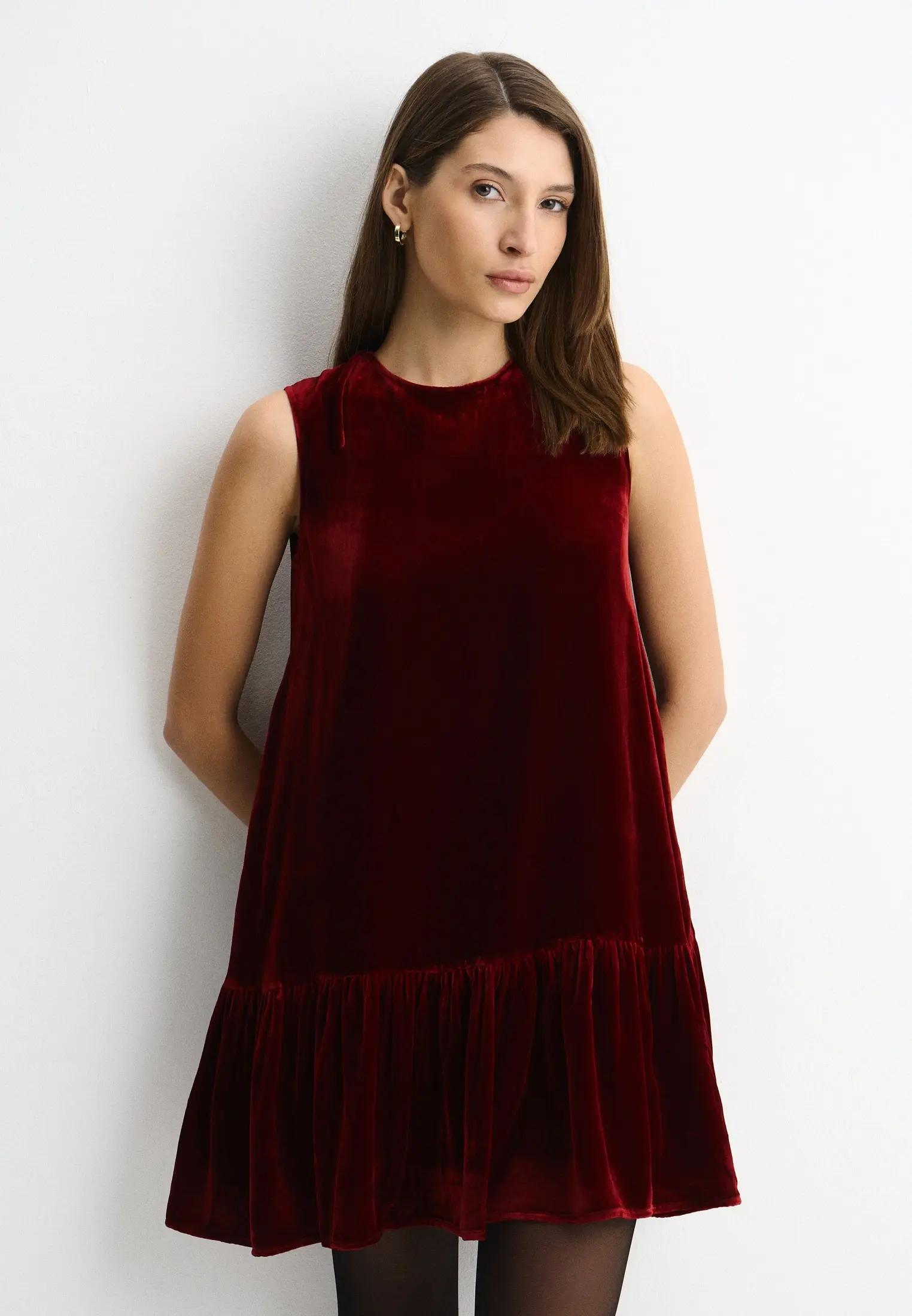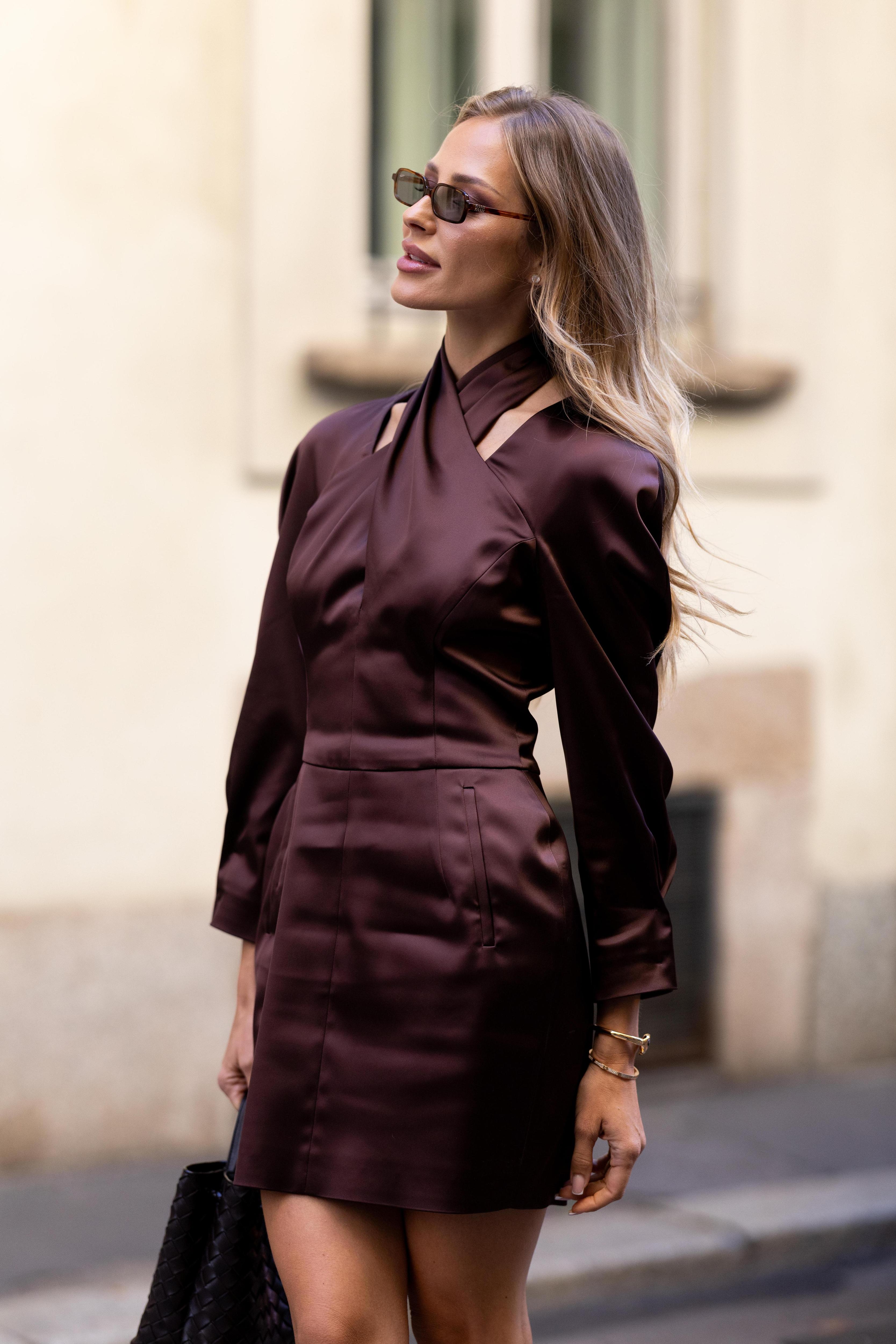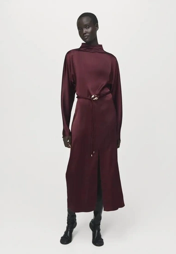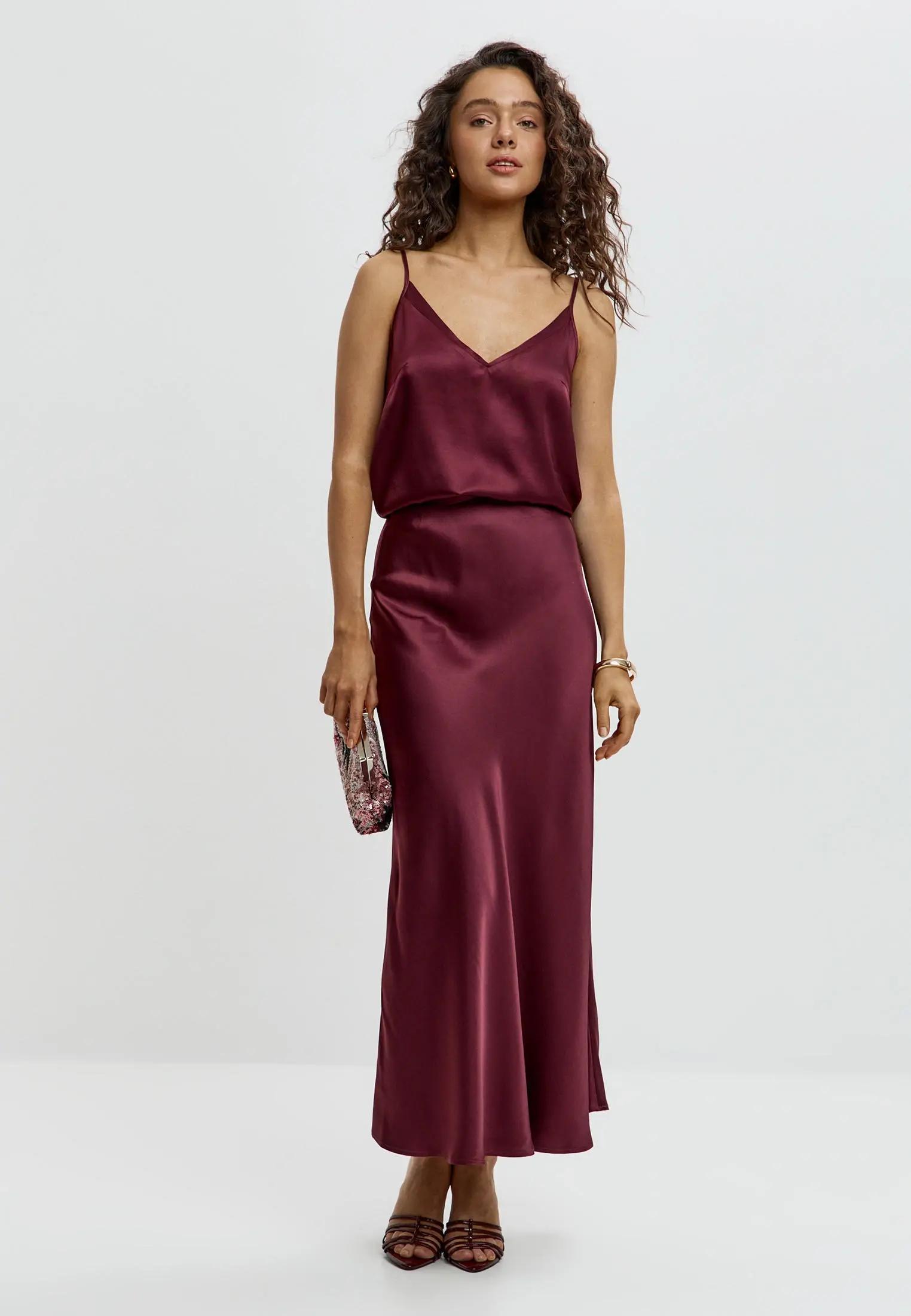 Особенно хорошо работают платья-колонны, асимметричные силуэты, бархатные миди и костюмы с топами на тонких бретелях — все в диапазоне от винно-черного до насыщенного ягодного.