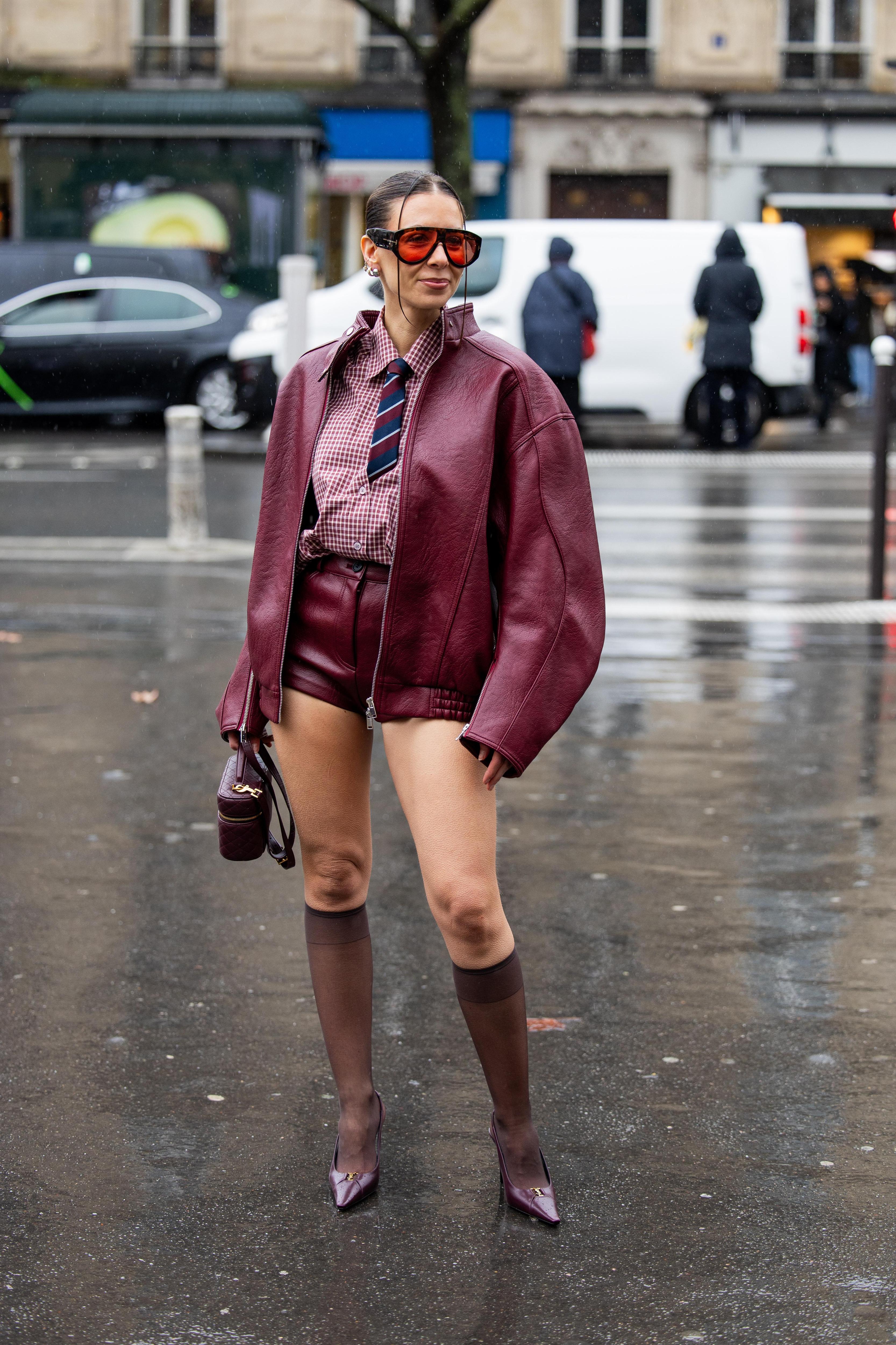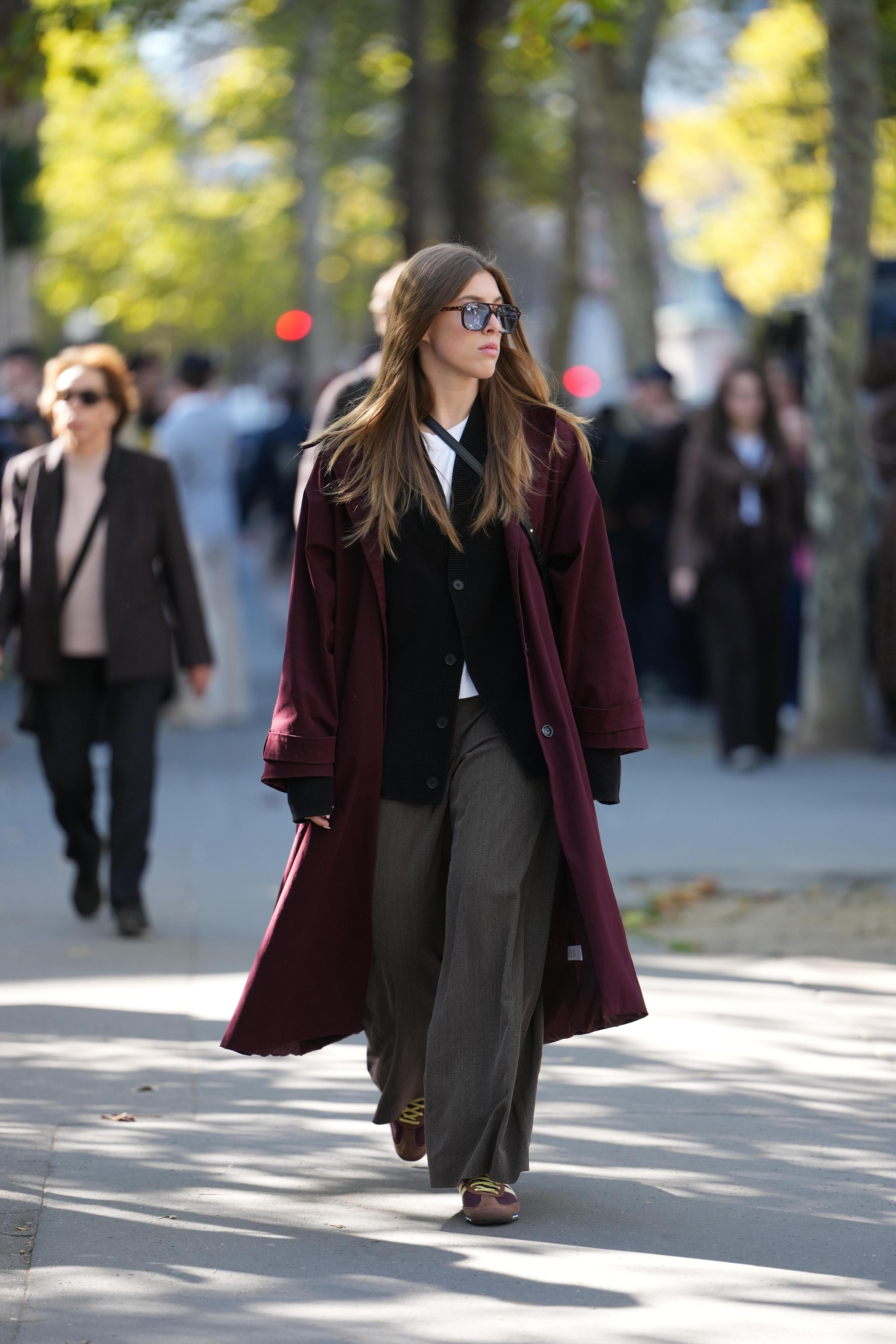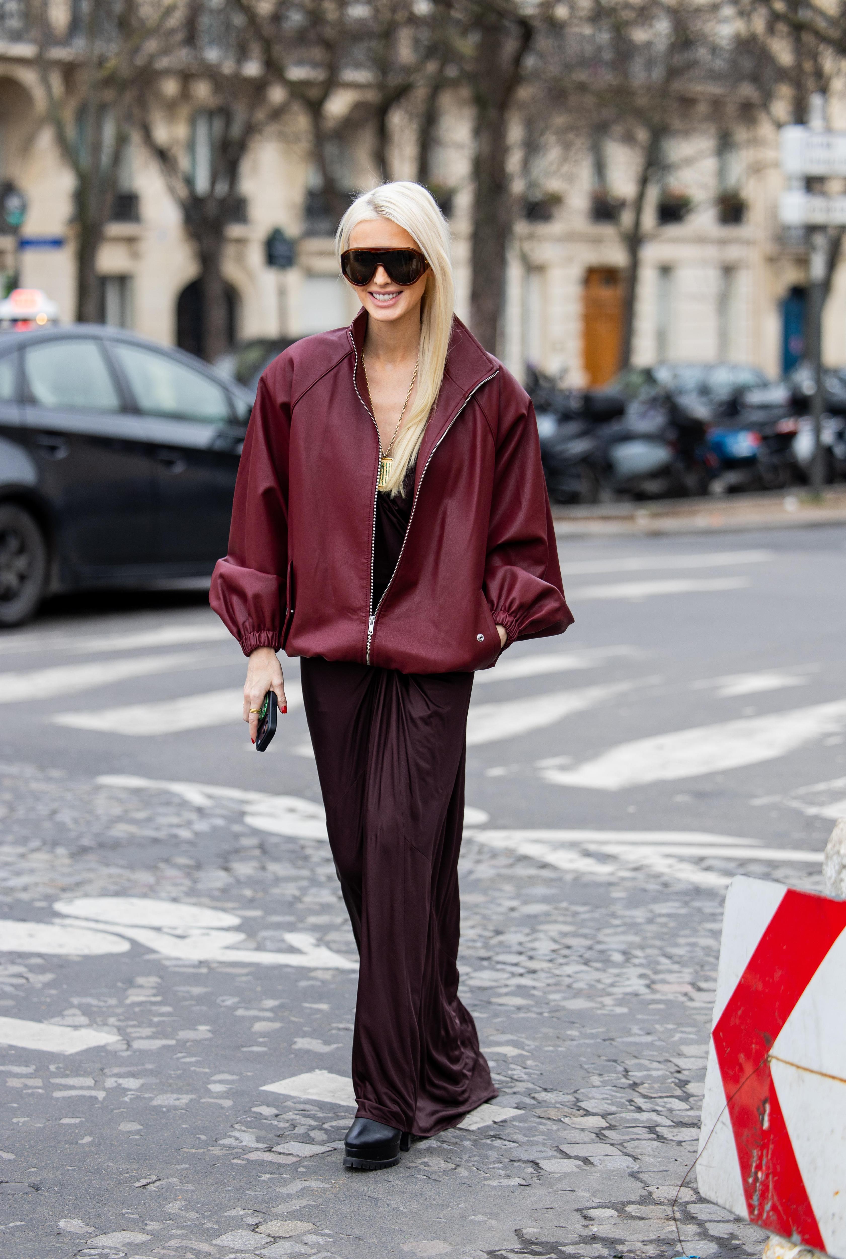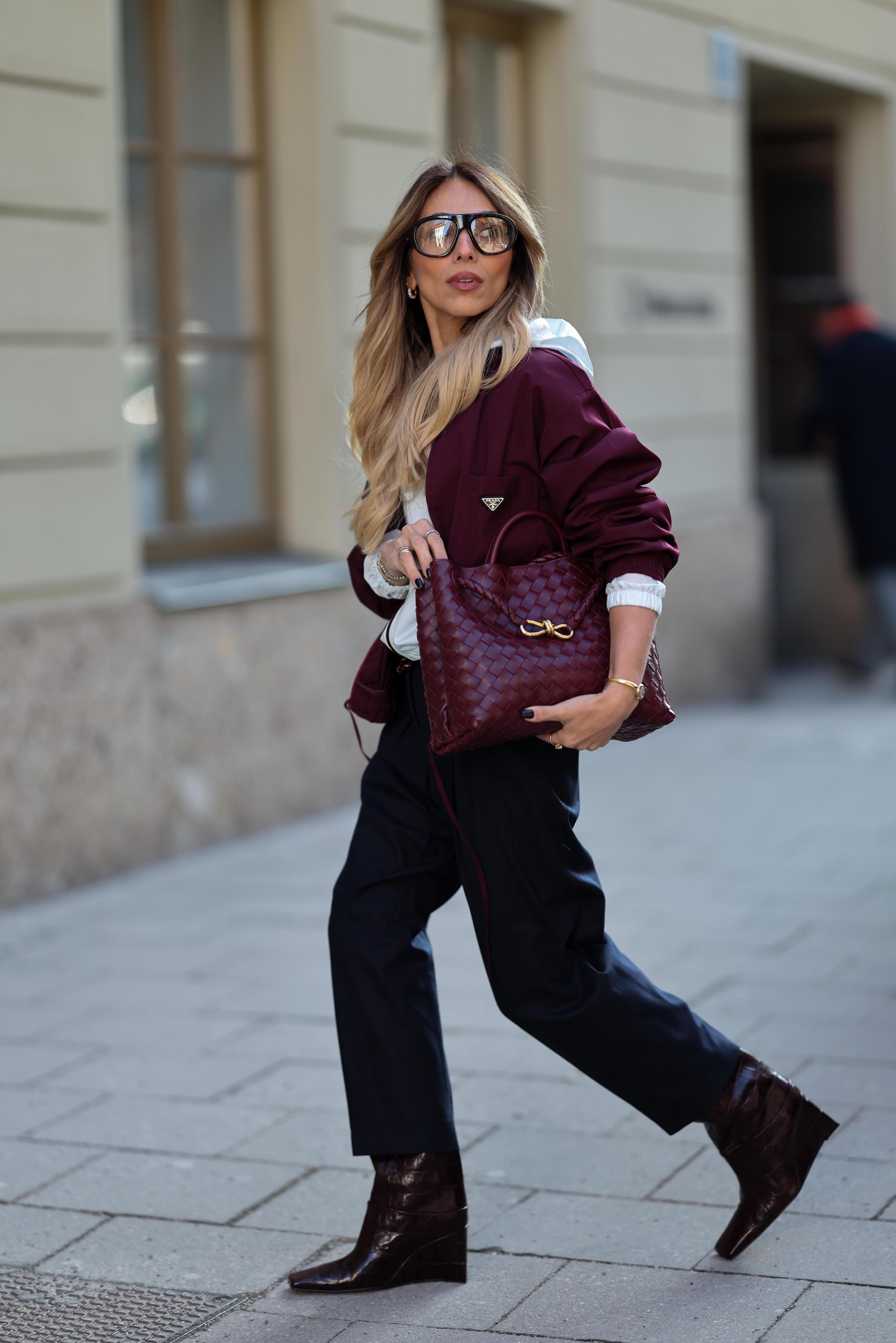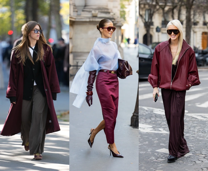Используйте Black Cherry в одной крупной детали (свитер, бомбер или кожаная куртка), а остальное оставьте максимально простым — деним, белый или серый верх, нейтральная обувь. Так вы как будто тестируете оттенок в спокойном режиме, но при этом уже получаете тот самый модный подиумный настрой.