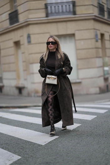 В таком образе вы точно не останетесь незамеченной. Кожа — это вечный тренд холодного сезона, поэтому вы не прогадаете, если выберете пальто или плащ из этой текстуры. Кожа может быть как лаковой, так и матовой, а оттенок рекомендуем коричневый — в 2025 году в тренде будет «Mocha Mousse» (читайте также: «Мокко мусс»: как носить главный цвет 2025 года).