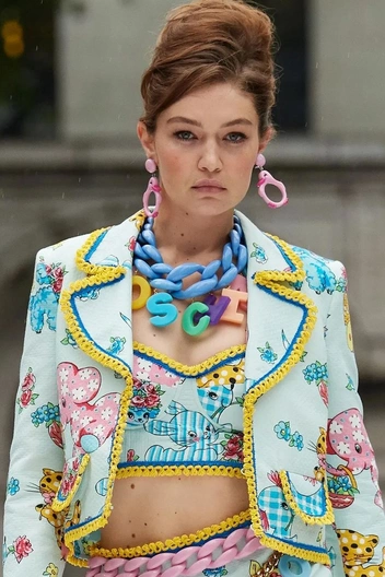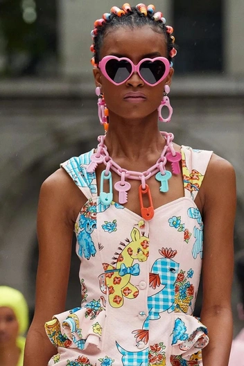 «Игрушечные» украшения, как на показе Moschino, с крупными пластиковыми цепями, массивными подвесками и серьгами в форме розовой утки, гармонично вписались в девчачьи аутфиты с платьями, расписанными детскими рисунками, а также к комплектам с кроп-топом, укороченным жакетом и юбкой. Джереми Скотт сделал ставку на максимализм и предложил клиентам сочетать сразу несколько массивных и броских украшений, а также не ограничиваться на выборе аксессуаров. По мнению дизайнера, поддержать наивные украшения можно цветным ремнем и солнцезащитными очками с линзами в форме сердца в розовой пластиковой оправе (читайте также: Самые модные солнцезащитные очки весны и лета 2022).