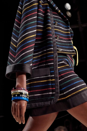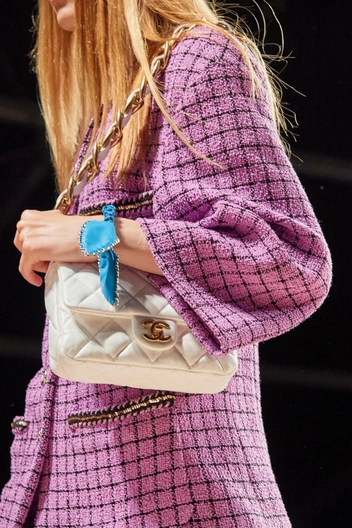 Разумеется, тренд захватил не только соц. сети, но и подиум, и даже крупные модные Дома для сезона весна-лето 2022 разбавили свои коллекции инфантильными и игривыми украшениями. Chanel добавили к классическим твидовыми костюмам тонкие цветные браслеты, а также модели, напоминающие резинку ««скранчи», и крупные подвески с замочками.