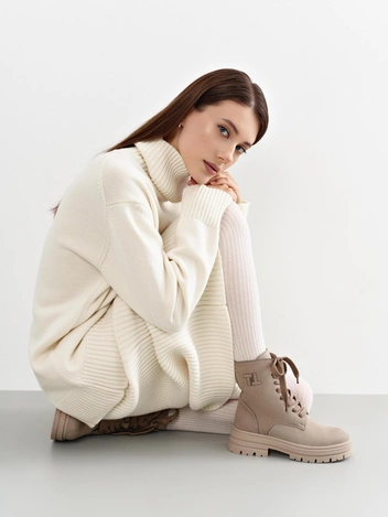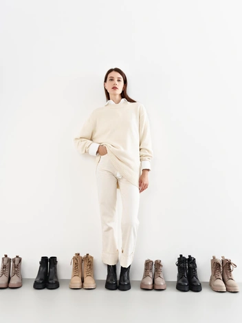 В основе коллекции бренда — кожаные ботинки в теплом бежевом и драматичном черном оттенках. Первая пара отличается широкими шнурками, которые эффектно держат форму и задают обуви стиль, а также рельефной подошвой, позволяющей стойко выдержать самые веселые катания на льду. Вторая же гармонично перекликается с модным трендом на гранж: тонкая шнуровка и металлические звенья превратят базовые аутфиты в смелые и стильные.