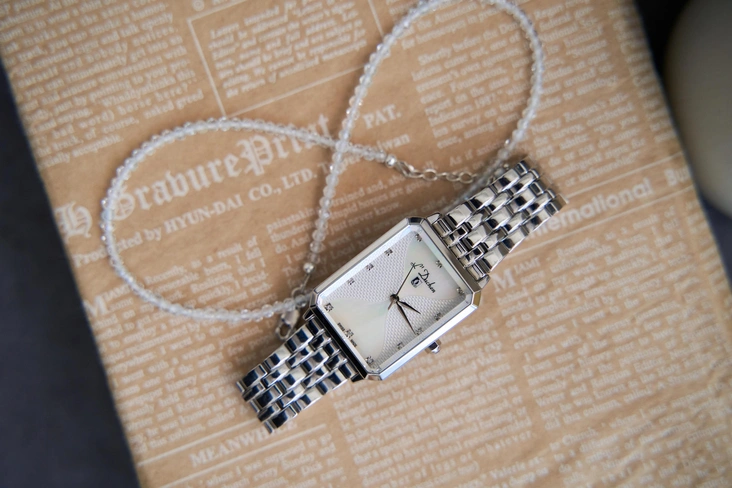 Циферблат из натурального перламутра украшает гильоше Clous de Paris, традиционный для швейцарских часов рисунок из множества «пирамидок». Элементы композиции складываются в очертания песочных часов, символа течения времени. Лучи света отражаются в двенадцати фианитах, надежно закрепленных в отполированных до зеркального блеска стальных оправах. Часы оснащены кварцевым механизмом Ronda 763.