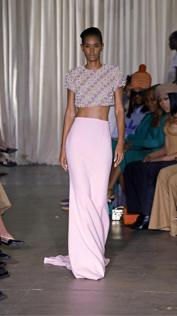Для баланса пропорций рекомендуем стилизовать модель с облегающим боди, лонгсливом или бадлоном или же выбирать укороченные свитеры, топы и водолазки, как на показах Sergio Hudson и Ester Manas.