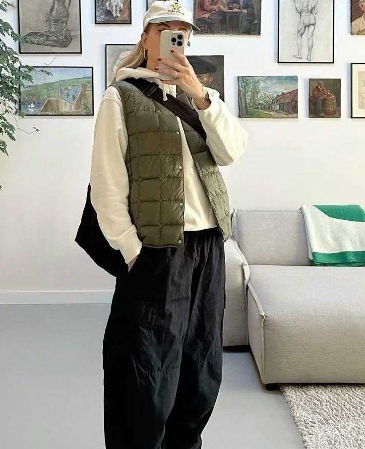 Такой жилет поможет составить классный аутфит в духе тихого аутдора — когда спортивные вещи сочетают с чем-то базовым, чтобы лук было легко представить в повседневной жизни. Как Миучча Прада накинула на моделей в платьях Prada FW/24 кислотно-зеленые ветровки в стиле горпкор, так и спортивный жилет от The North Face или Arc'teryx будет отлично смотреться с юбкой карандаш длины макси, простыми прямыми брюками из костюмной ткани и трикотажным лонгсливом. Если же экспериментировать не хочется, соберите полностью аутдорный образ с болоневыми брюками, трекинговыми кроссовками Salomon, сумкой через плечо и теплой флисовой кофтой.