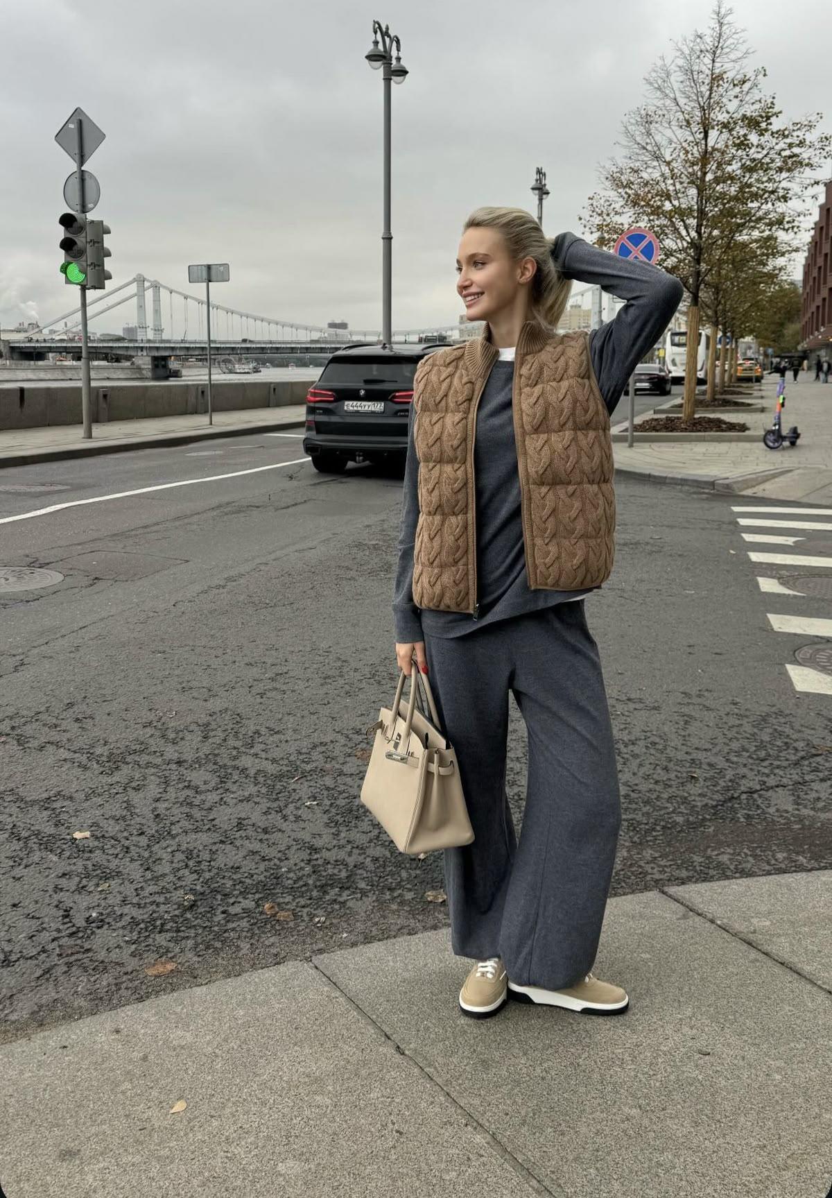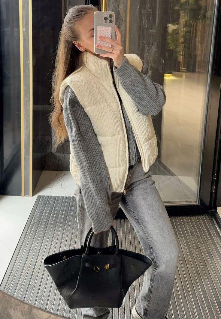 За минималистичные образы отвечают трикотажные жилеты. Из шерсти или кашемира, с узорами в виде кос или просто крупной пряжей — они всегда смотрятся хорошо, особенно если речь о жилете в спокойном оттенке. Тут лучше сделать ставку на базу: бежевый, слоновая кость, черный, темно-серый или синий будут смотреться безупречно и подойдут под классический образ. Какой именно? Тут есть много опций: подберите трикотажный костюм в тон жилету, наденьте прямые темные брюки с любимым осенним свитером, леггинсы в черном цвете и высокие жокейские сапоги. Что-то более экспериментальное, как джинсы бэгги на низкой посадке или трекинговые кроссовки лучше оставить для следующего жилета нашей подборки.