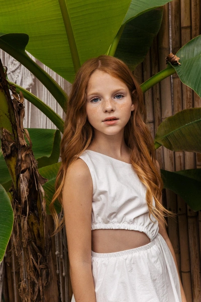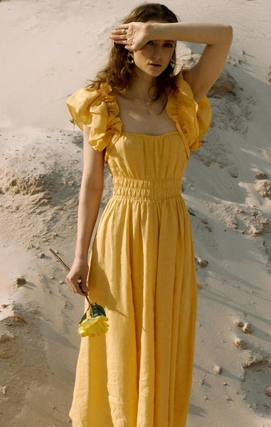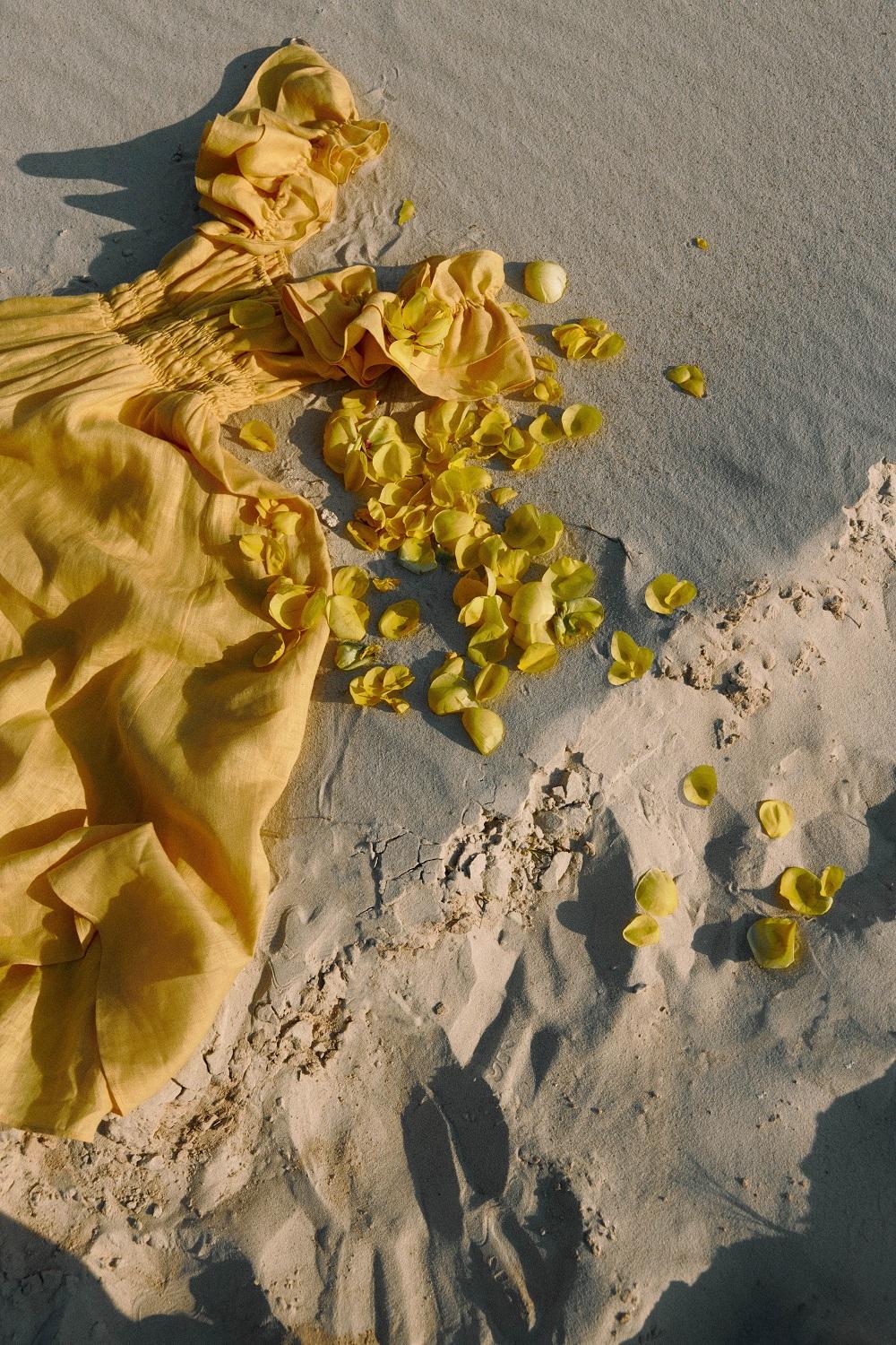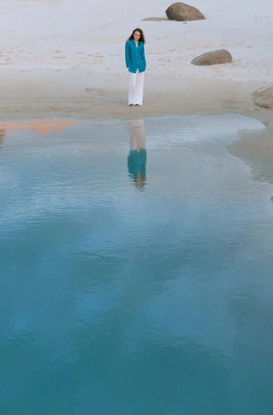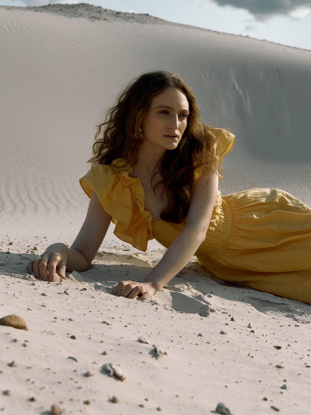 Героиня съемки задумчиво прогуливается по заброшенному карьеру в разных образах. Общая меланхоличность атмосферы контрастирует с яркими красками одежды. Горчично-желтое платье изо льна c бретелями на резинке и свободная бирюзовая рубашка выступают как самодостаточные объекты съемки. Белоснежный брючный костюм с туникой — необходимая вещь для отпуска.