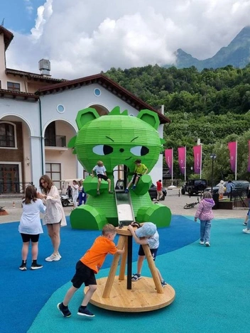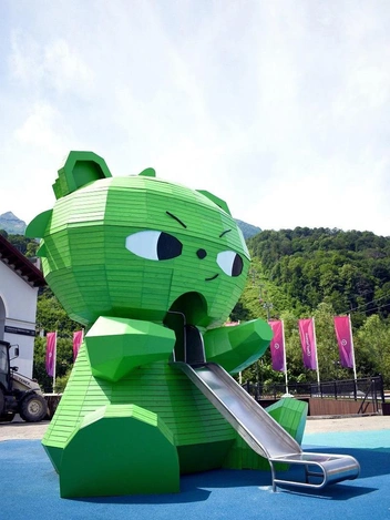 Главный элемент площадки — четырехметровая горка, выполненная в виде маскота бренда — зеленого монстра Вигге. Пространство дополняют деревянные столбики-лабиринт, качели-балансир и маятниковые качели-гнездо.
