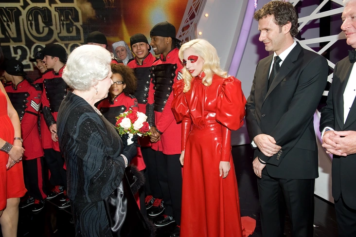 В то время Леди Гага явно была смелее в выборе нарядов — тогда певица вовсю экспериментировала с самыми необычными сценическими образами (правда, легендарное мясное платье появится только в следующем году). Певица познакомилась с Королевой Елизаветой после выступления на Royal Variety: звезда предстала в вишневом латексном платье с ослепительным красным макияжем из страз (читайте также: Как Леди Гага стала настоящей леди (и почему она больше не королева эпатажа)).