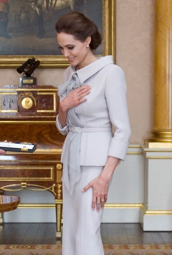 В 2014 году Королева Елизавета наградила Анджелину Джоли почетным титулом кавалерственной дамы — в Великобритании он является женской «версией» рыцарского титула. Монарх отметила гуманитарную работу голливудской звезды и поблагодарила ее за благотворительную деятельность. Анджелина выглядела скромно, но впечатляюще: звезда примерила лаконичный костюм с юбкой-миди и серые лодочки.