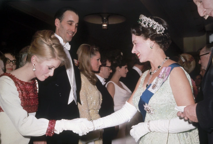 Французская кинозвезда виделась с Королевой дважды. Первая встреча произошла в 1966 году на премьере ленты «Рожденная свободной», где как раз присутствовала Ракель Уэлч. Катрин выглядела ничуть не менее элегантно, чем ее коллега по цеху: американская дива выбрала наряд с отделкой красным бисером, присборенные перчатки и подходящие переливающиеся серьги.