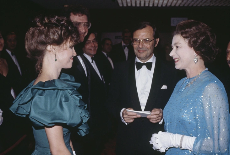 Во время встречи с Королевой актриса Сибилл Шеперд была беременна, однако это совсем не помешало ей выбрать впечатляющий наряд, который подойдет для девушек любых форм. На премьере ленты «Леди исчезает» в 1979 году она предстала в прозрачном платье-кафтан с перьями, бисером и открытой спиной.