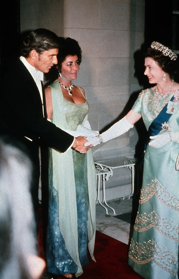 Две иконы встретились на благотворительном гала-вечере в 1976 году. Интересно, что Елизавета и Элизабет выбрали для торжества схожие вечерние платья. Тейлор сделала ставку на открытый вариант с градиентом и декольте, украсив его впечатляющим колье, а Королева предпочла закрытое платье с золотыми узорами.