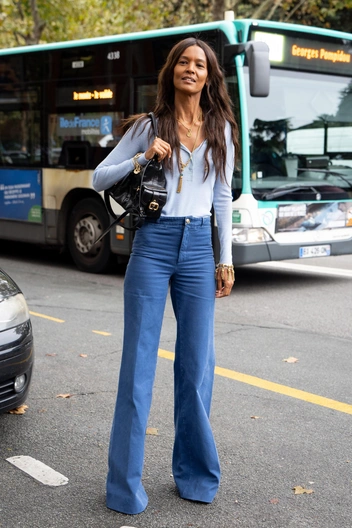 Широкие, даже безразмерные джинсы, мы видели на показах и стритстайл-выходах еще в прошлом году, и в 2025-м этот тренд никуда не уйдет. К таким брюкам подбираем обувь на каблуке, чтобы визуально удлинить ноги и избежать порчи ткани. Впрочем, подойдут и балетки, а также кроссовки, если эти детали для вас не важны. На верх рекомендуем простую белую рубашку или джемпер, чтобы уравновесить объемный силуэт. В свежих коллекциях также приметили сочетание джинс с олимпийками в стиле 90-х или джинсовыми рубашками. Последний вариант позволит создать джинсовый тотал-образ, который сейчас в моде.