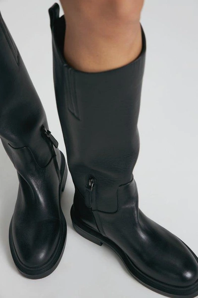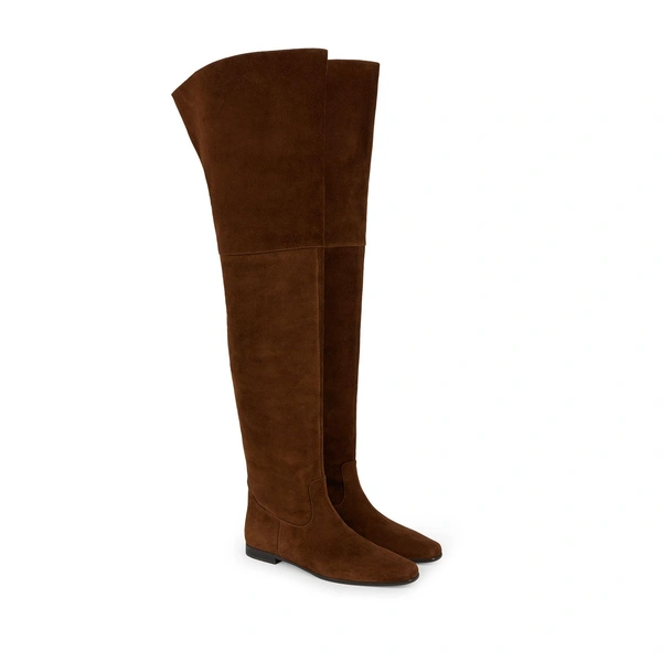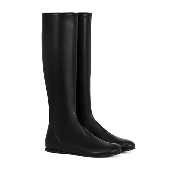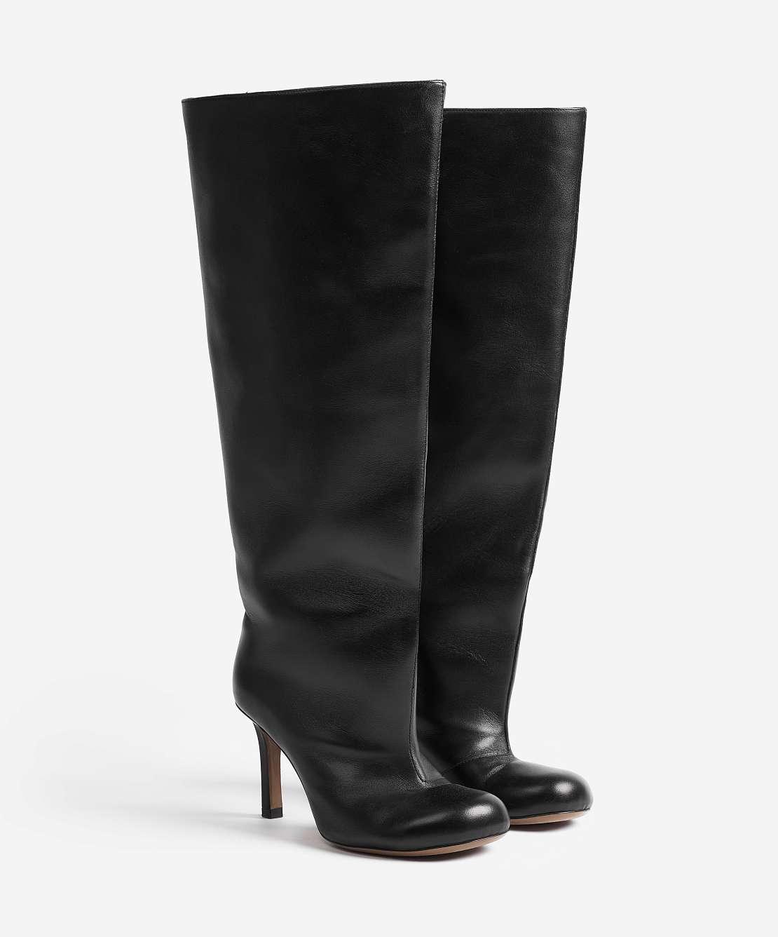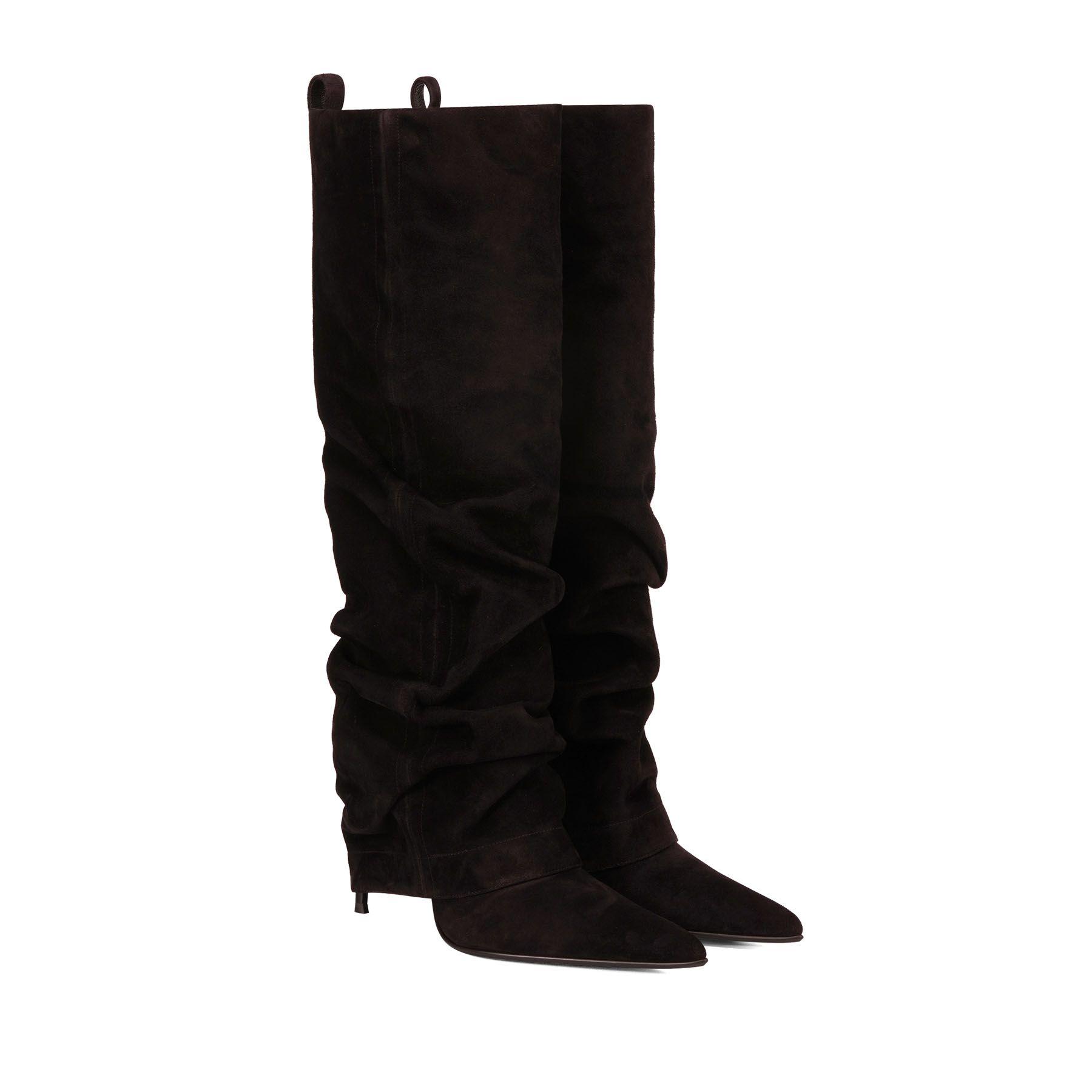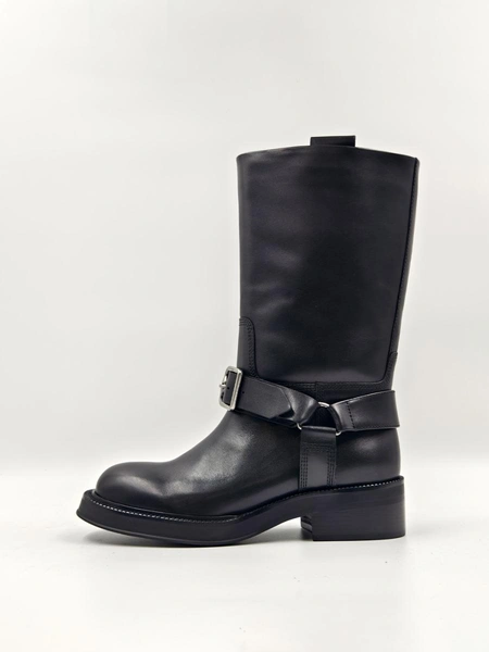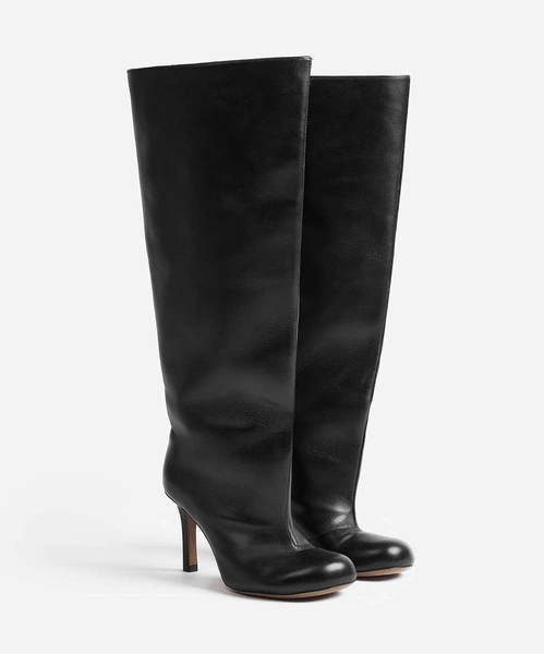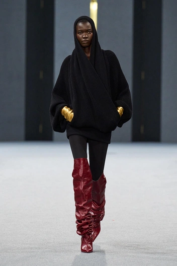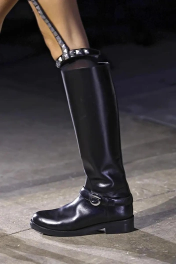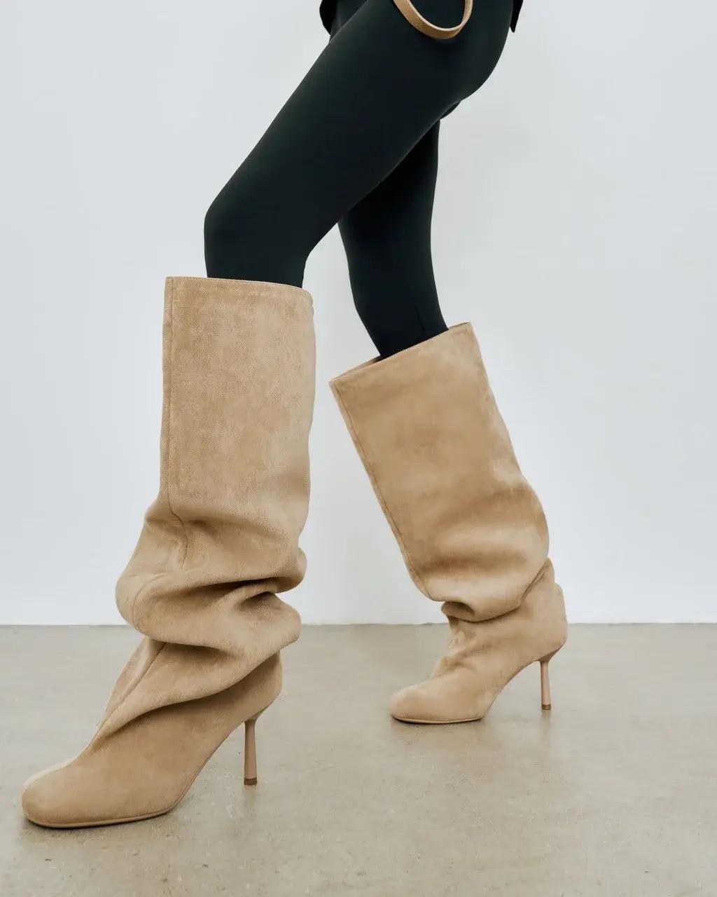 Полярная тенденция — это широкие сапоги-трубы. За счет свободной посадки в области лодыжки образуются складки, и именно они делают сапоги универсальными и стильными одновременно. Примеры нашлись на Неделях моды сезона осень-зима/2025-26, где Sportmax вывели модель в черных сапогах по колено, а Louis Vuitton в милых замшевых ботинках с голенищем-гармошкой. Кстати, присобранная ткань — это уже полноценный тренд, который мы видели ранее и на лоферах.