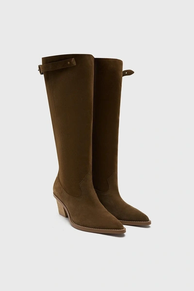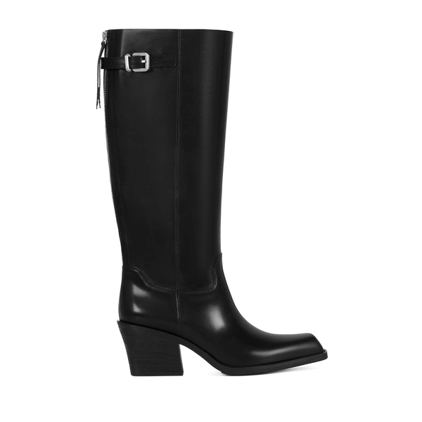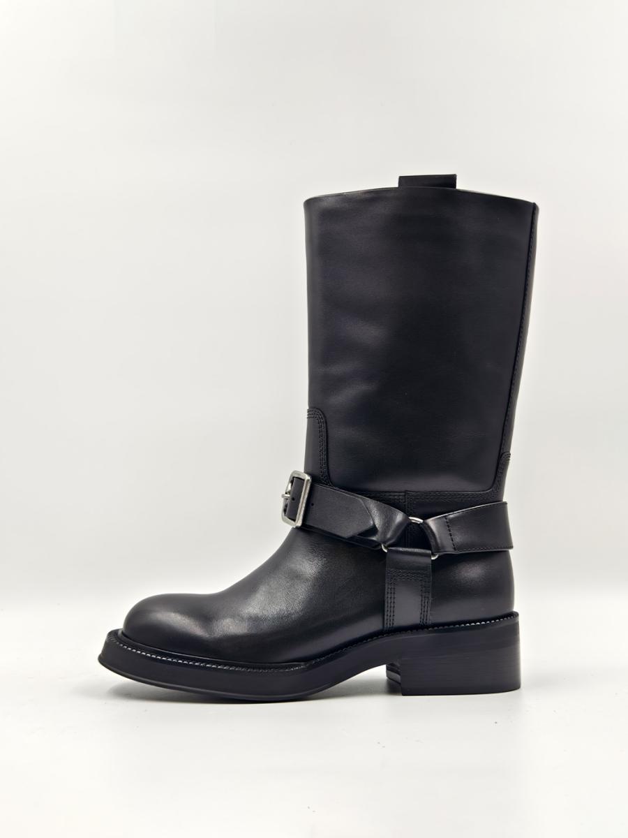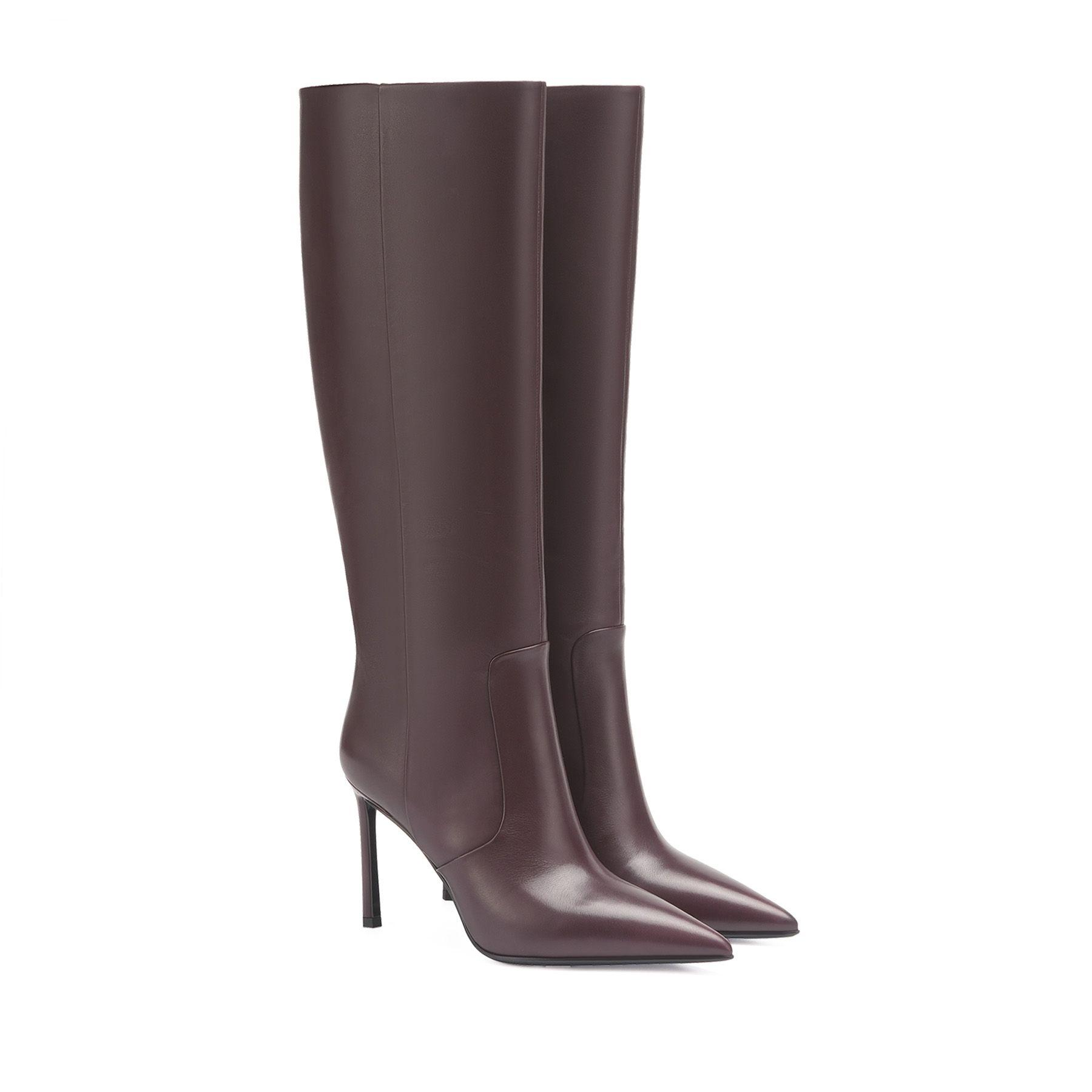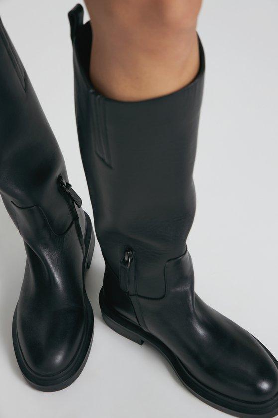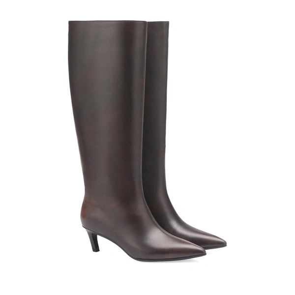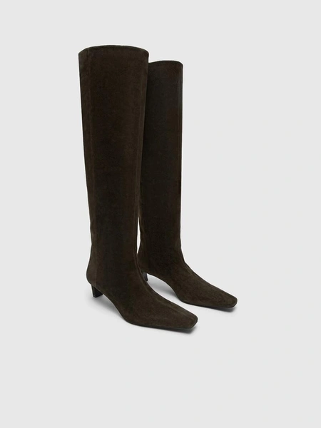Базовые фасоны никогда не выходят из моды, и этот осенне-зимний сезон исключением не станет. Речь о классическом силуэте с тонким каблуком и узким мысом. Длина может быть самой разной — от чуть возвышающейся над щиколоткой до заканчивающейся немного ниже колена. Хотите сделать образ интереснее? Тогда подберите сапоги стандартного фасона в трендовом оттенке. Осенью 2025 года смело делаем ставку на глубокий баклажановый, изумрудно-зеленый и яркий кирпичный. Но не забываем и про базу: вишневый, коричневый и черный всегда впишутся в гардероб.