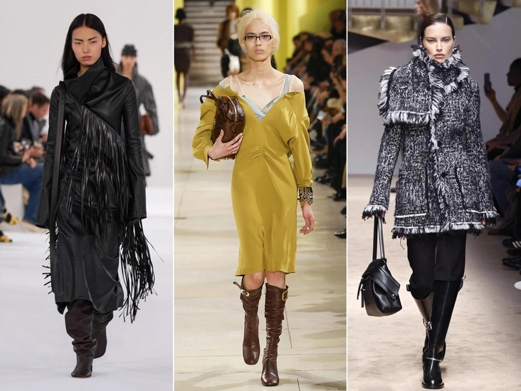 Как носить такие сапоги? Они будут отлично смотреться с платьями в стиле бохо или юбками макси с рюшами, которые были на шоу Chloe FW/2025-26. Куда более спокойный вариант — сочетать ковбойскую пару с прямыми джинсами, брюками из костюмной ткани или твидовыми шортами.
