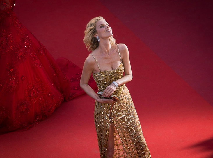 На контрасте с Сарой сыграла чешка Ева Герцигова, которая появилась на подступе к Дворцу в приталенном золотом платье Roberto Cavalli. Модели из коллекций дизайнера фигурируют в Каннах чаще других, и мы наверняка увидим еще немало их звездных трактовок.