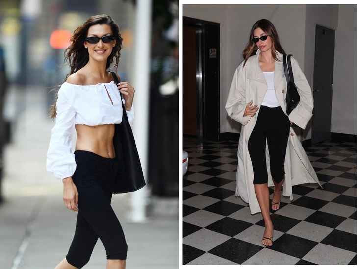 Другой, более повседневный вариант — капри из спортивной ткани, напоминающие короткие легинсы. Такие хоть с худи, хоть с более деловым образом, как Хейли Бибер — но об этом чуть ниже.